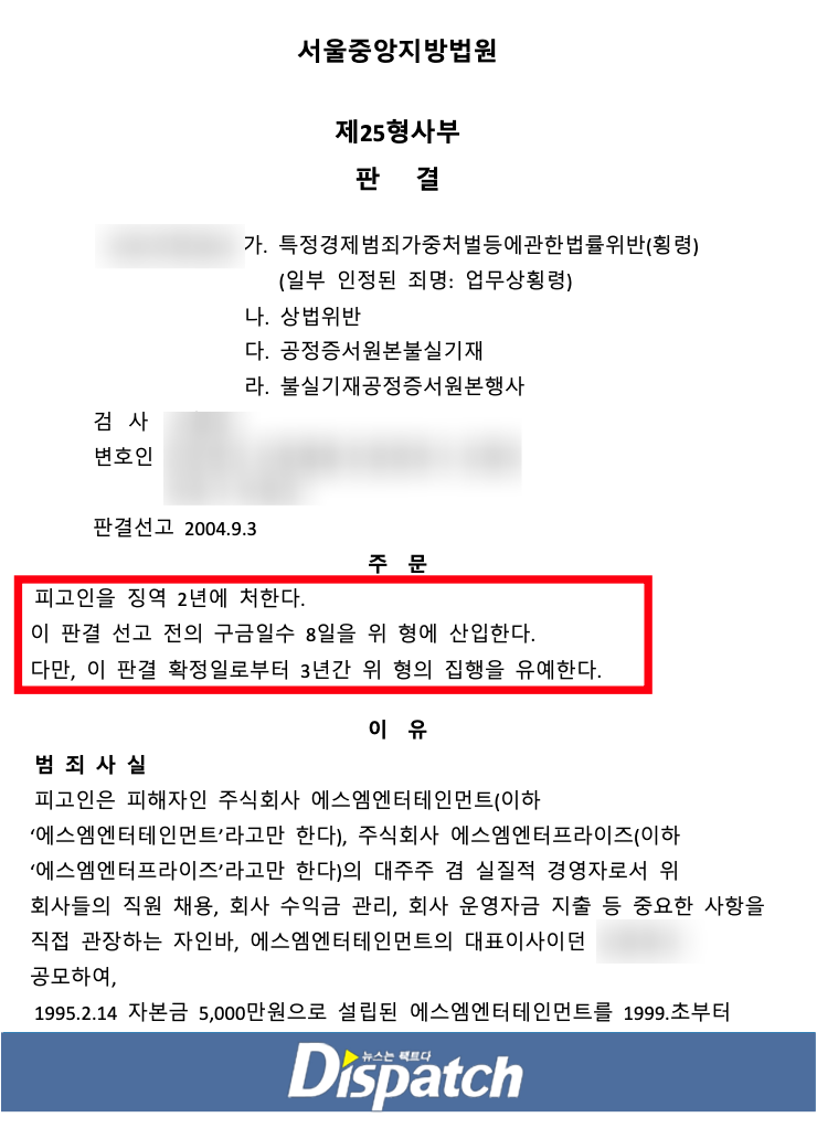 “이수만은 회사자금 11억 5,000만 원을 횡령해 주식인수대금으로 사용했다. 실질적인 자본의 증거 없이 주금의 납입을 가장하고, 법인의 자본이 증가된 것처럼 불실의 사실을 기재했다. 죄질이 중해 그에 상응하는 처벌이 불가피하다.” (재판부)
