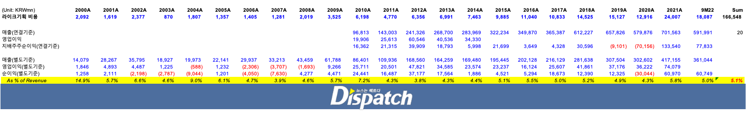 116. 2021년을 살펴보자. SM의 매출은 4,170억 원. 영업이익은 740억 원이다. 라이센스 비용은 240억 원.