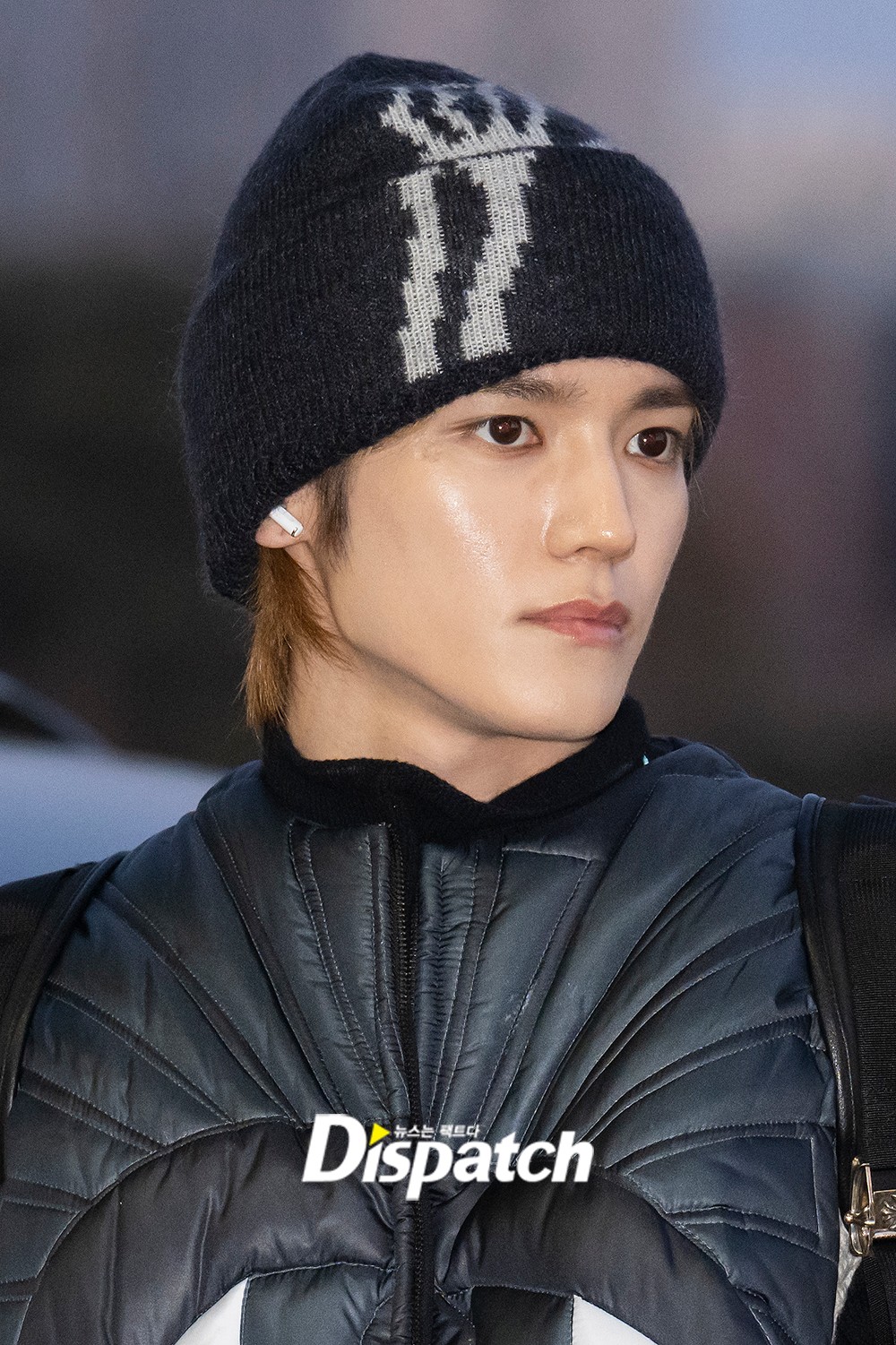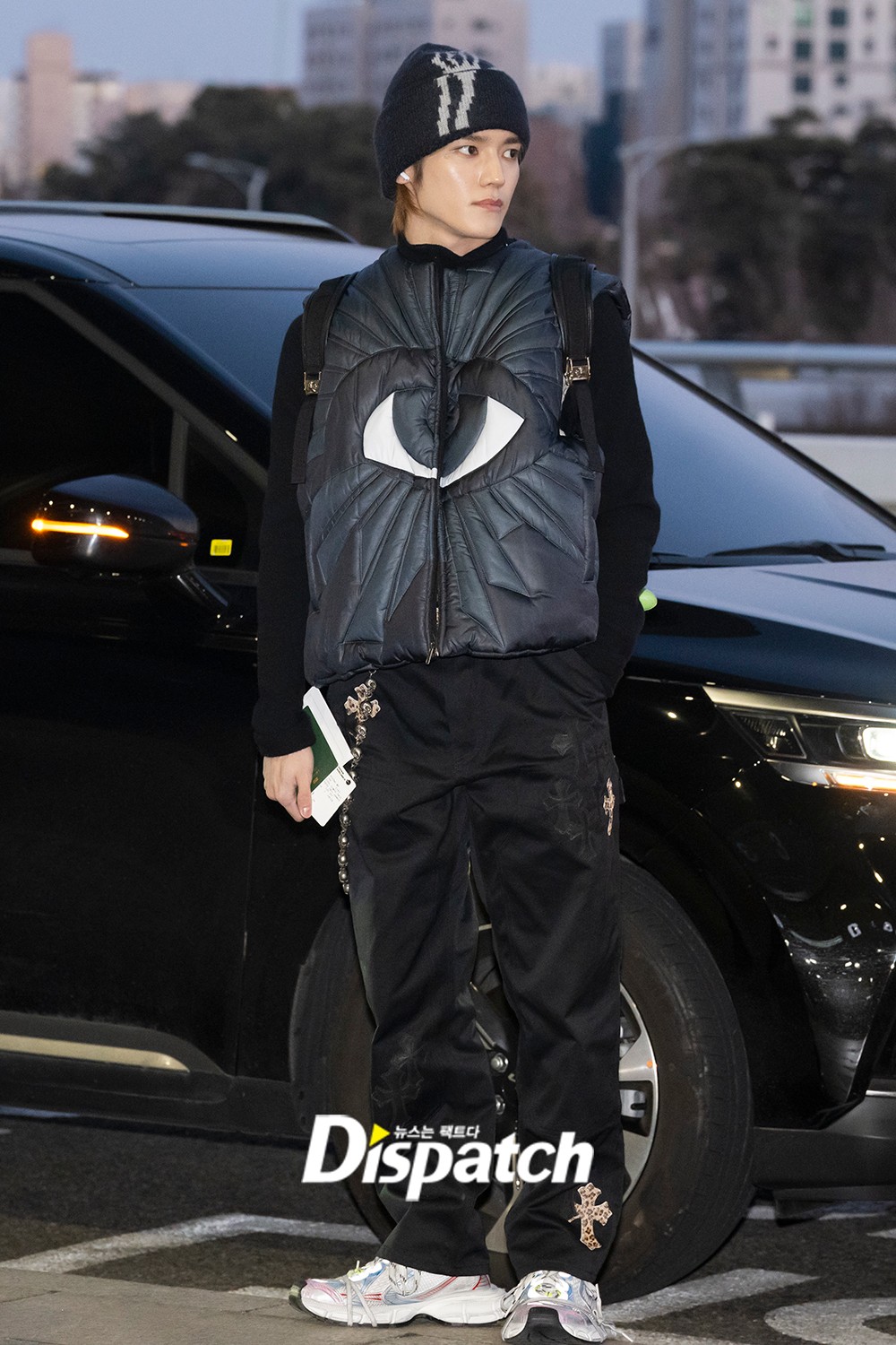 태용은 블랙 패딩에 블랙 팬츠를 매치했다. 조각같은 비주얼이 돋보였다.