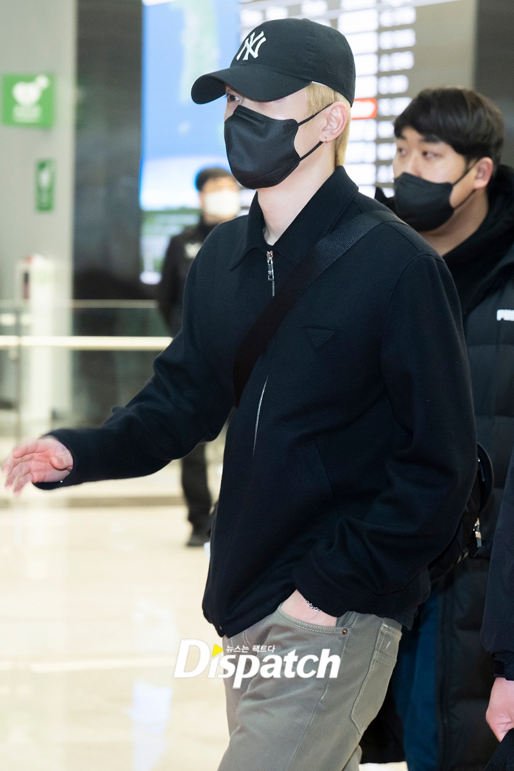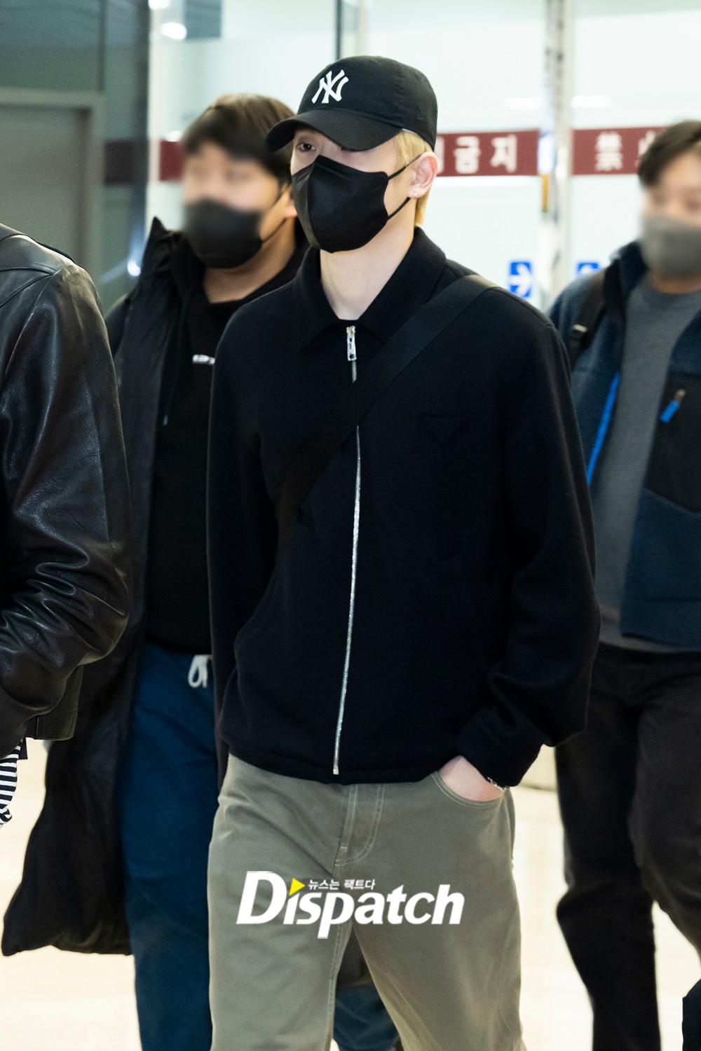 재현은 블랙 재킷에 카키색 바지로 시크한 공항패션을 완성했다.