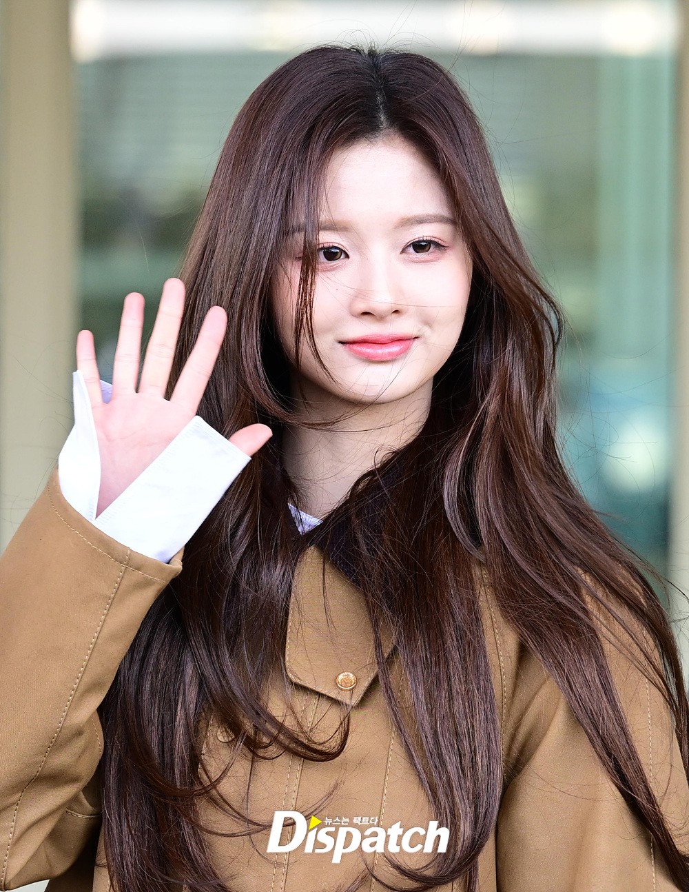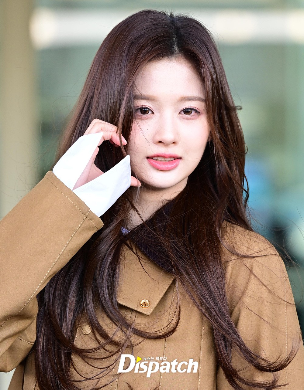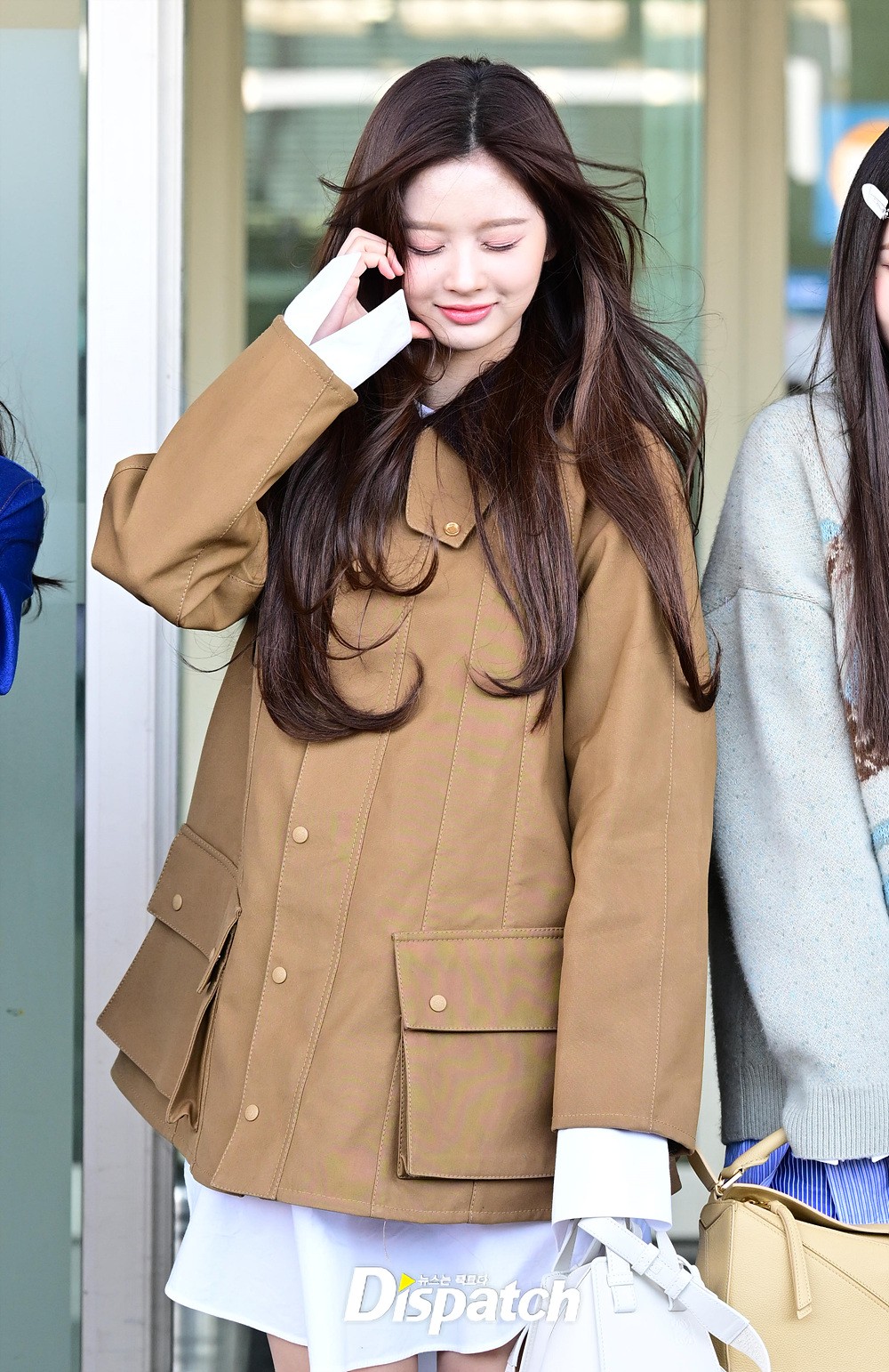 설윤은 브라운 컬러의 재킷과 화이트 원피스로 산뜻한 공항패션을 선보였다. 인형같은 이목구비도 눈길을 끌었다.