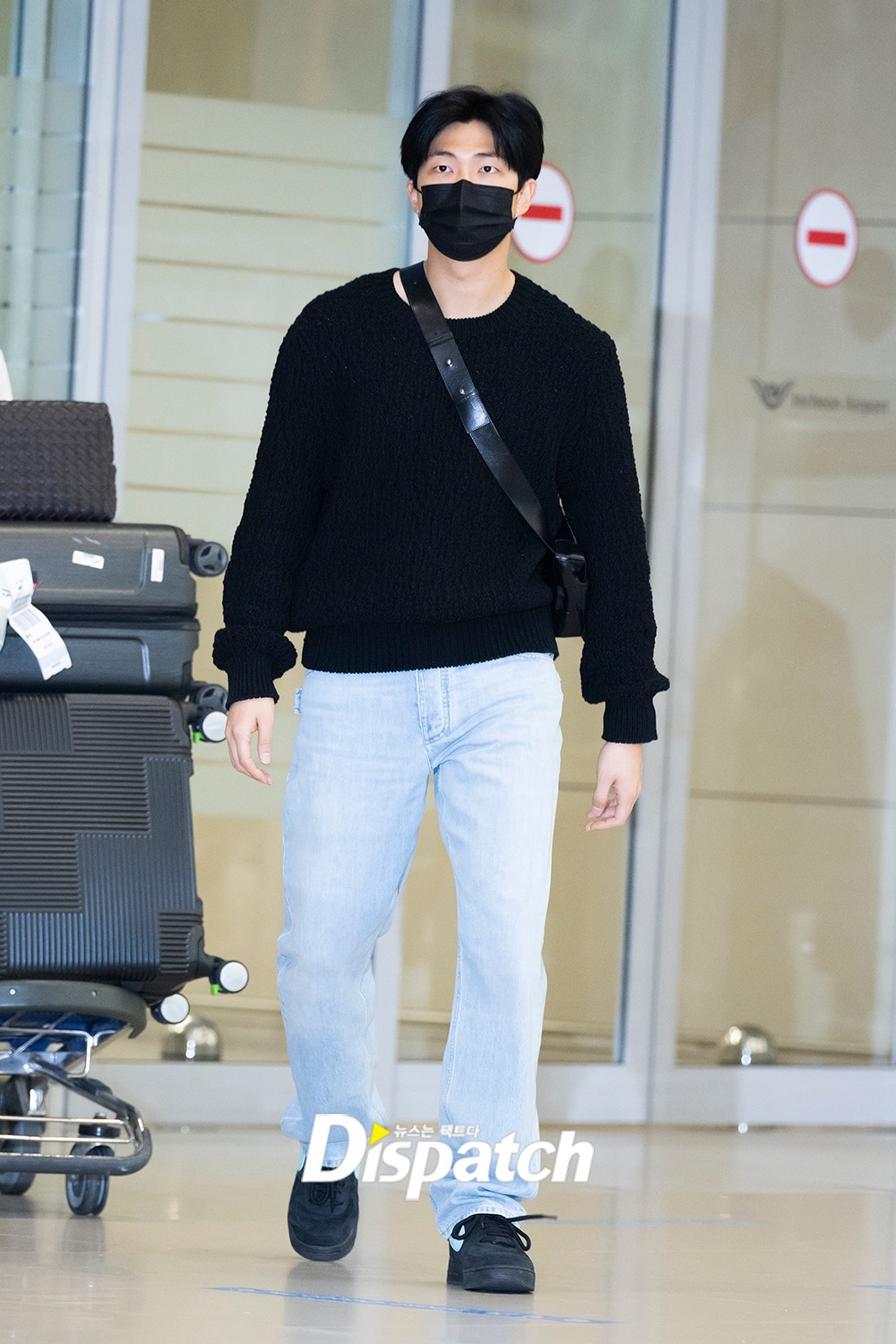 RM은 블랙 니트티셔츠에 청바지로 캐주얼한 공항패션을 완성했다.