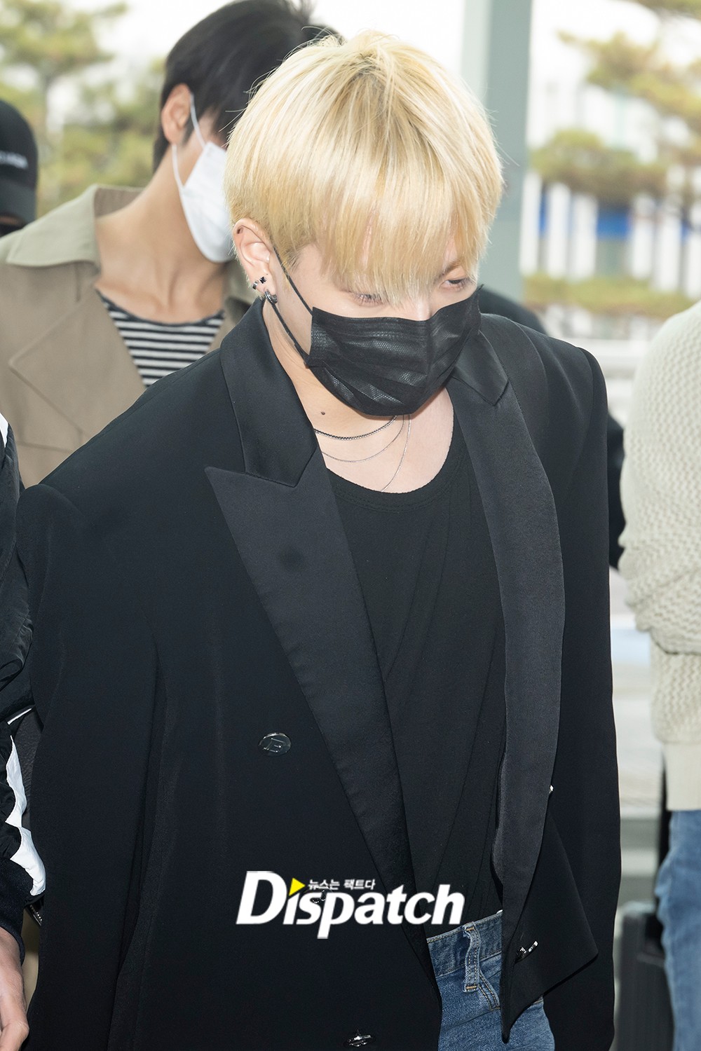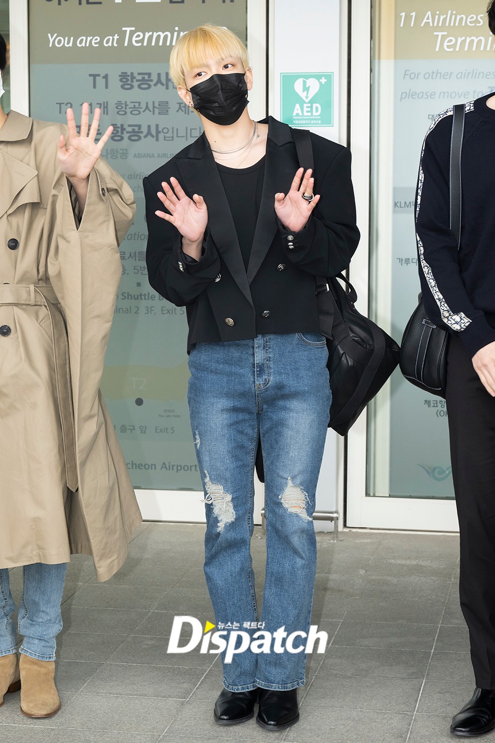 홍중은 블랙 재킷에 청바지로 캐주얼한 공항패션을 완성했다.