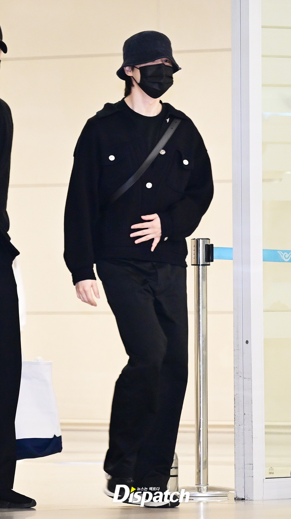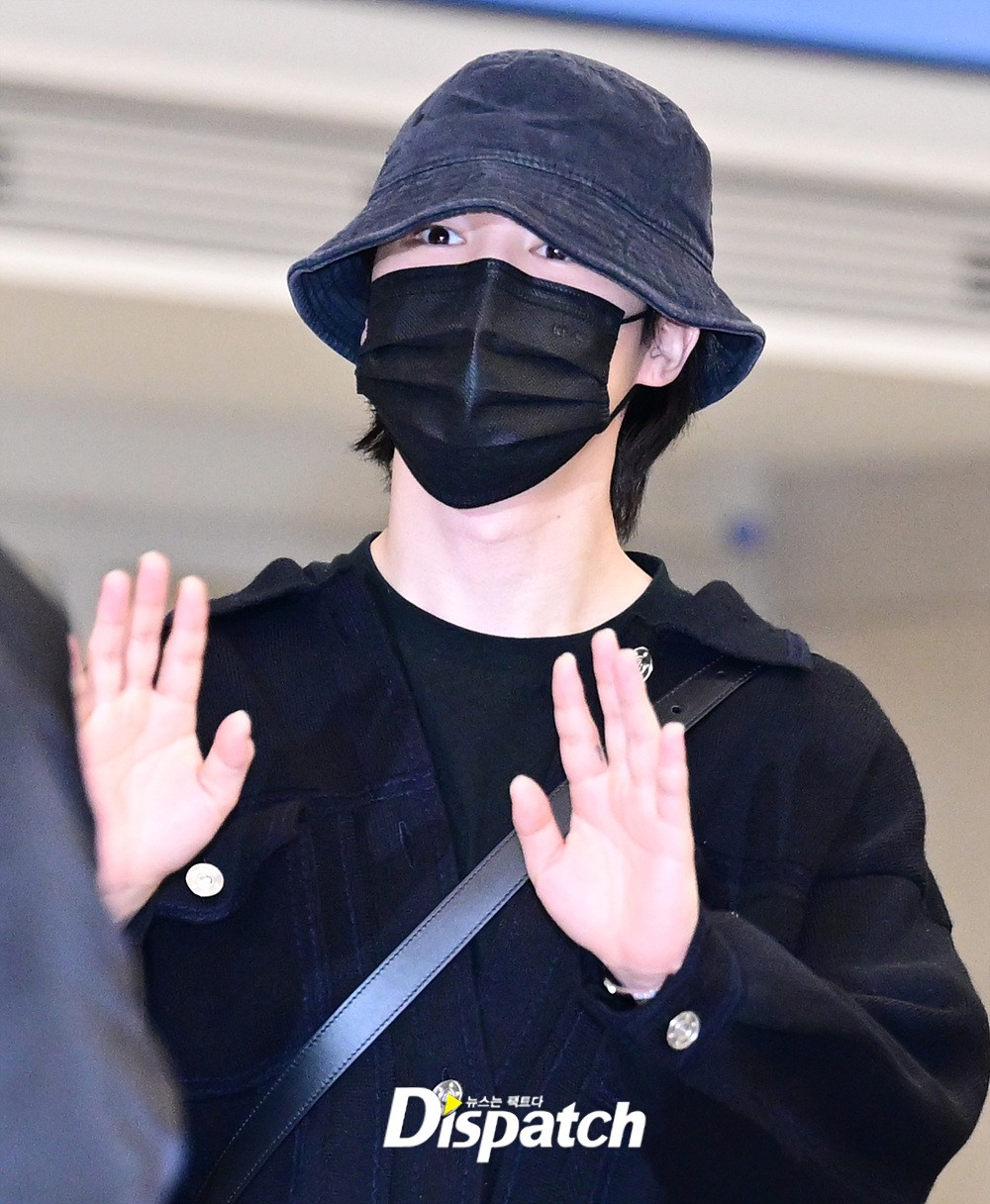 지민은 올블랙룩으로 시크한 매력을 선보였다. 공항에 모인 많은 팬들에게 손인사로 화답하는 모습이였다.