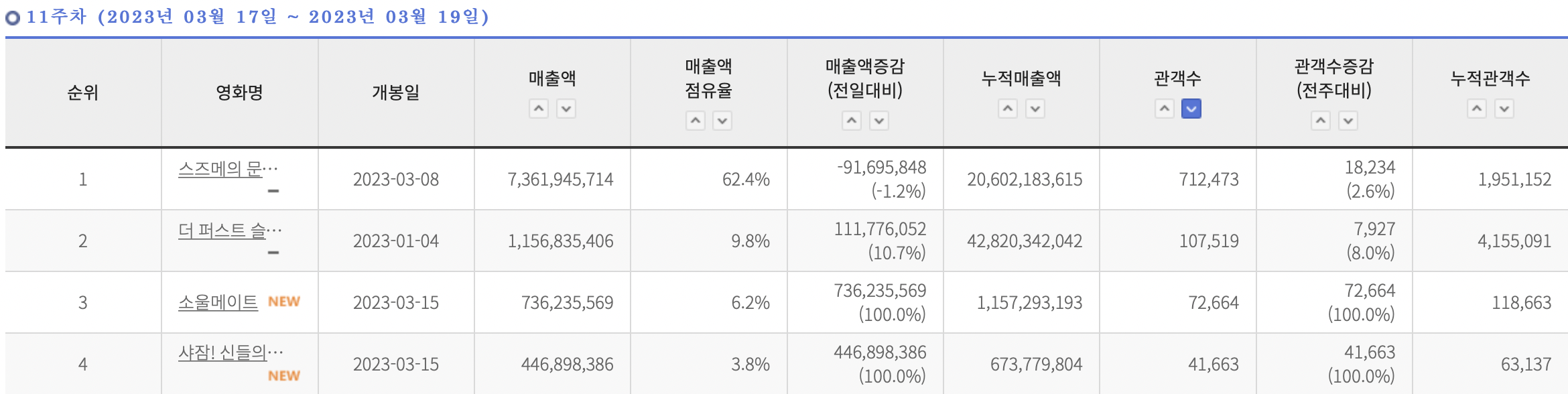 김다미 주연 영화 ‘소울메이트’(감독 민용근)가 3위에 자리했다. 첫 주 주말 7만 2,664명을 모았다. 누적관객수는 11만 8,663명이다.