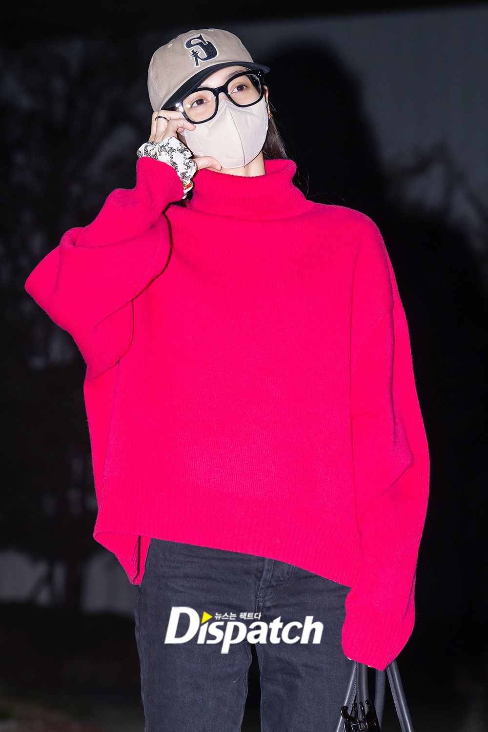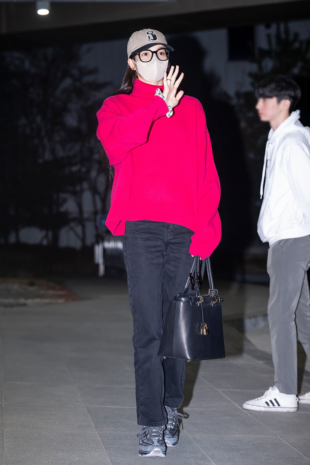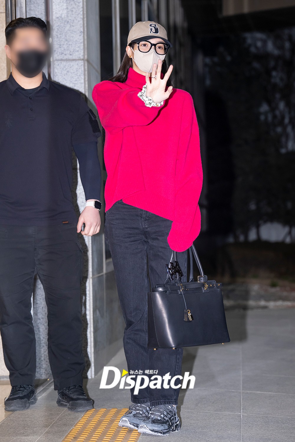 리사는 레드 니트에 블랙 팬츠로 귀여운 분위기를 연출했다.
