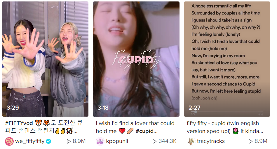 시작은 ‘틱톡’이었다. 한 해외 유저가 ‘큐피드’를 ‘최고의 프리코러스’라 극찬한 것. ‘스피드 업’ 버전은 빠르게 입소문을 탔다. 40만 개 이상에 클립이 생성됐다. 해시태그도 6,500만 개 이상 쓰였다.