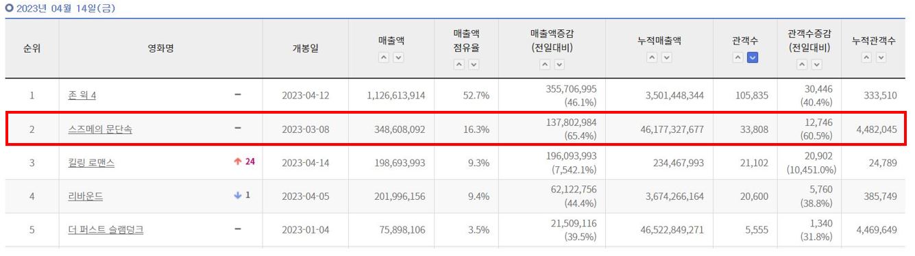 영진위 영화관입장권 통합전산망에 따르면, ‘스즈메의 문단속’은 14일 기준 누적 관객수 4,48만 2,045명을 돌파했다.