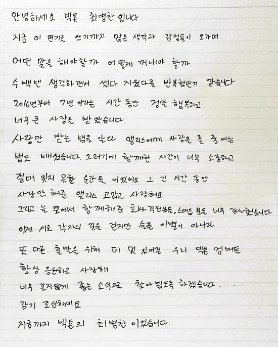 최병찬은 이날 개인 SNS에 자필 편지를 올렸다. "이 편지를 쓰기까지 많은 생각과 감정들이 오갔다. 수백 번 썼다 지웠다를 반복했다"며 말문을 열었다.