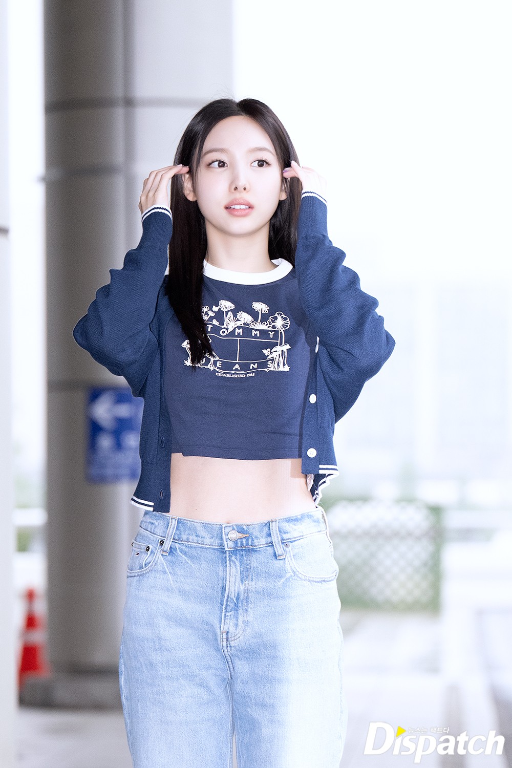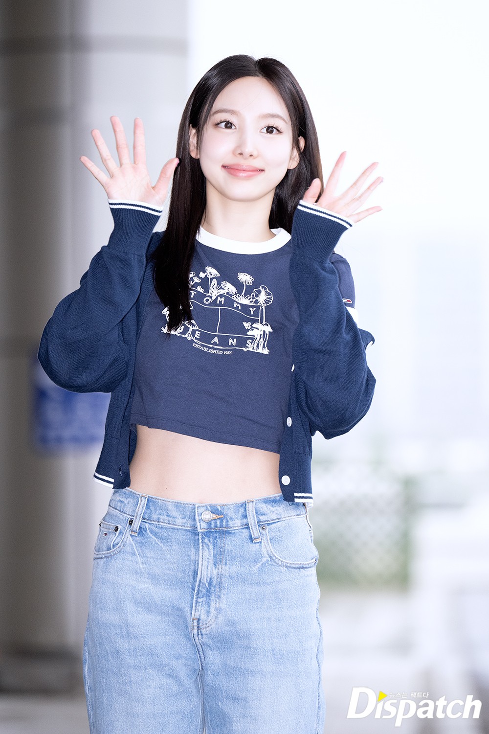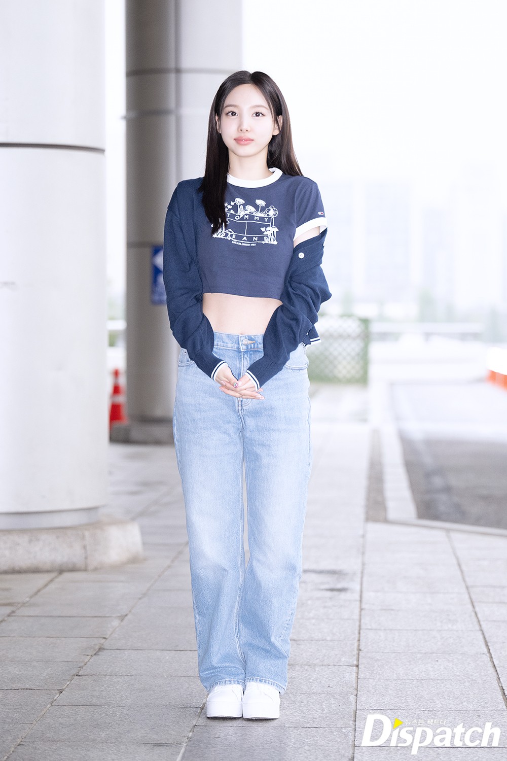 나연은 이날 청바지에 크롭 티셔츠를 매치해 러블리한 공항패션을 연출했다. 깜찍한 미모가 돋보였다.