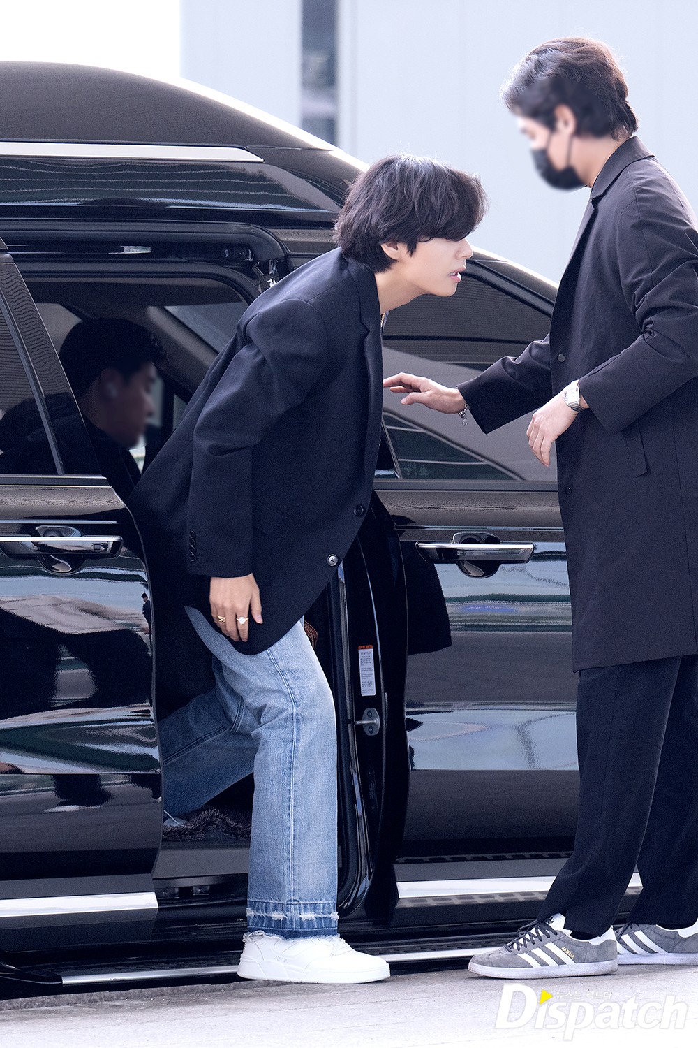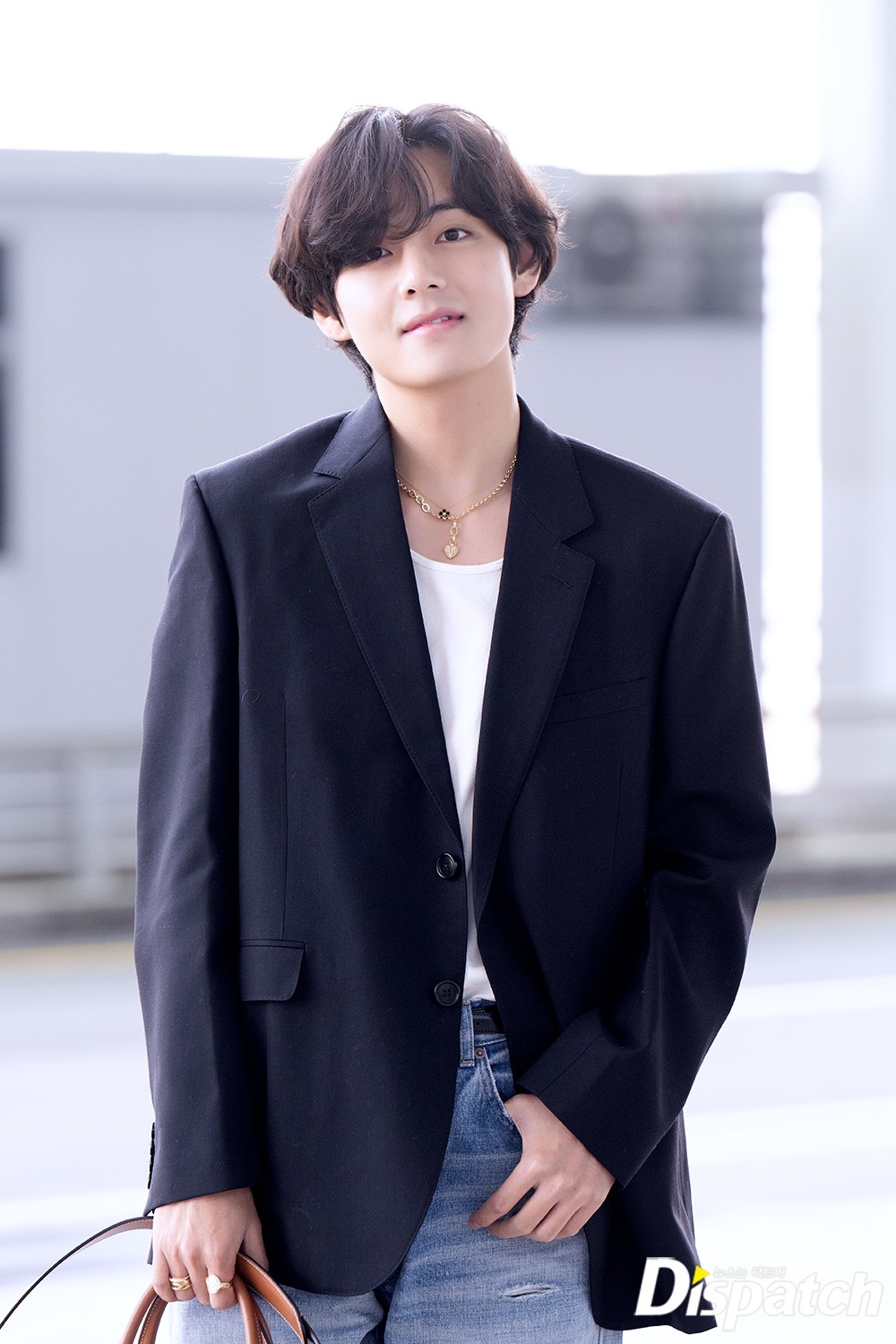 뷔는 이날 청바지에 블레이져 재킷을 매치해 댄디한 공항패션을 연출했다. 조각같은 비주얼이 돋보였다.