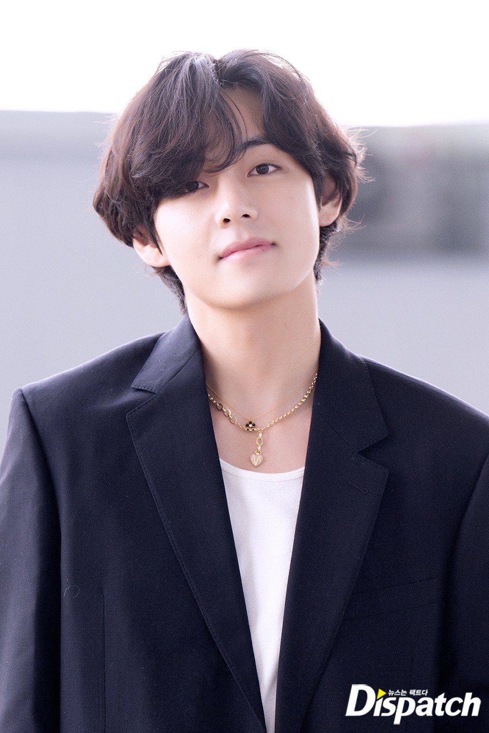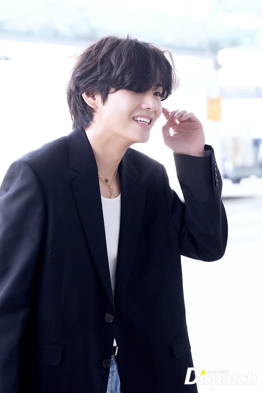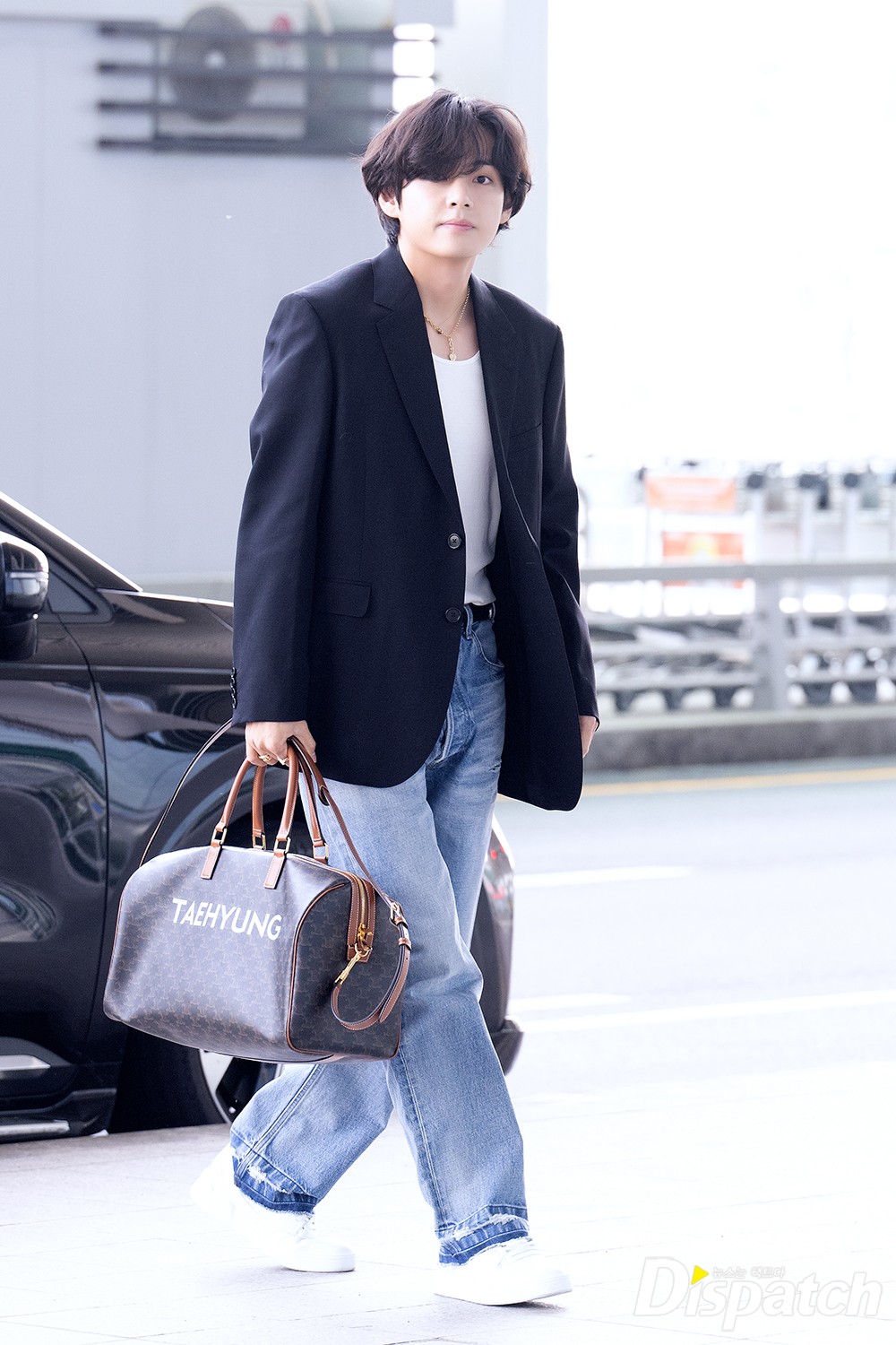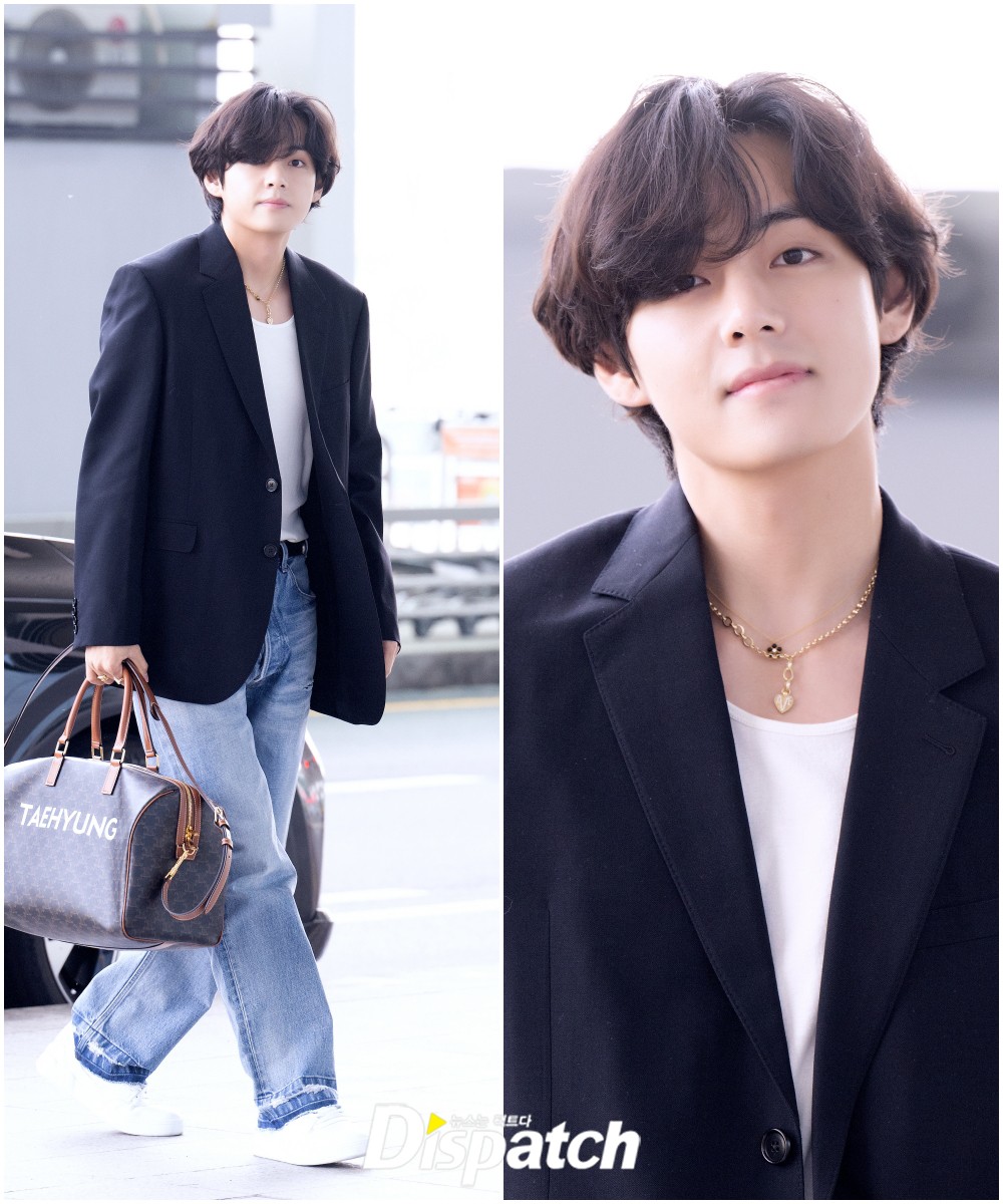 뷔는 이날 청바지에 블레이져 재킷을 매치해 댄디한 공항패션을 연출했다. 조각같은 비주얼이 돋보였다.