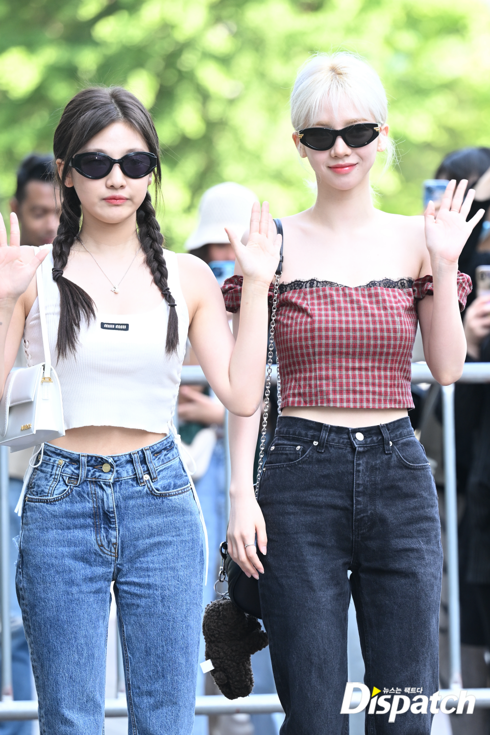 '에스파' 카리나는 오프숄더 블라우스와 데님 팬츠로 멋을 냈다. 금발 헤어스타일이 아름다움을 더했다.