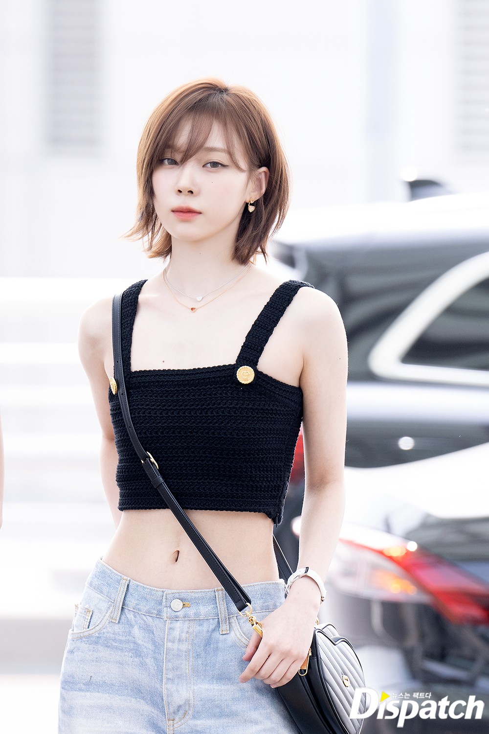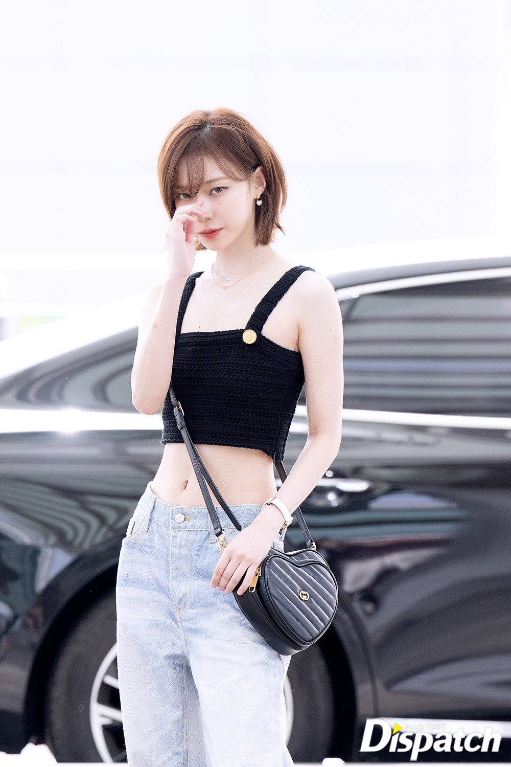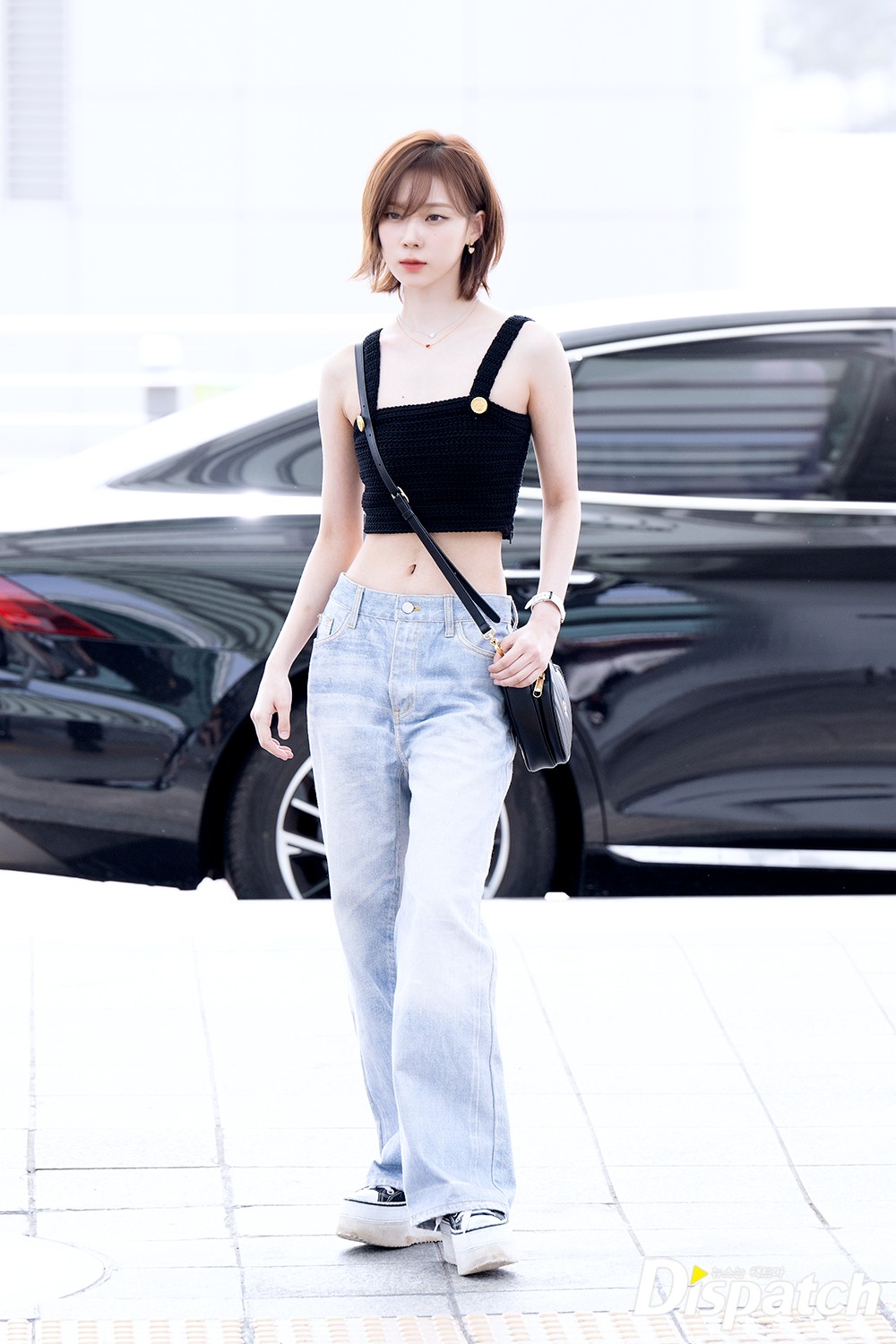윈터는 이날 청바지에 블랙 크롭톱으로 시크한 공항패션을 연출했다. 우아한 분위기가 돋보였다.