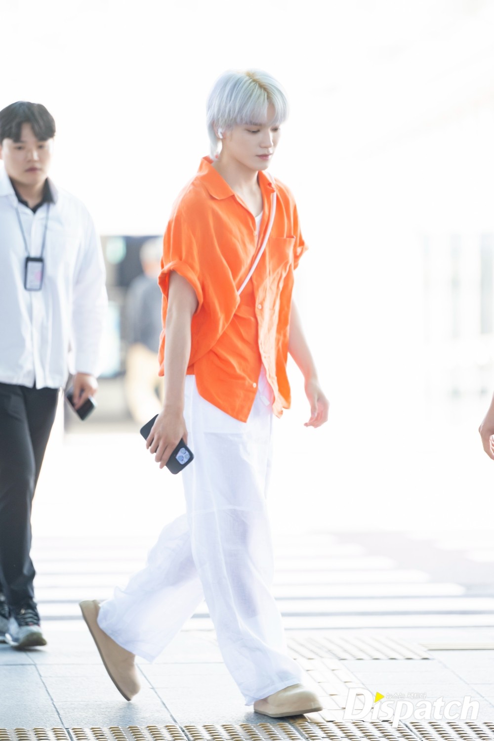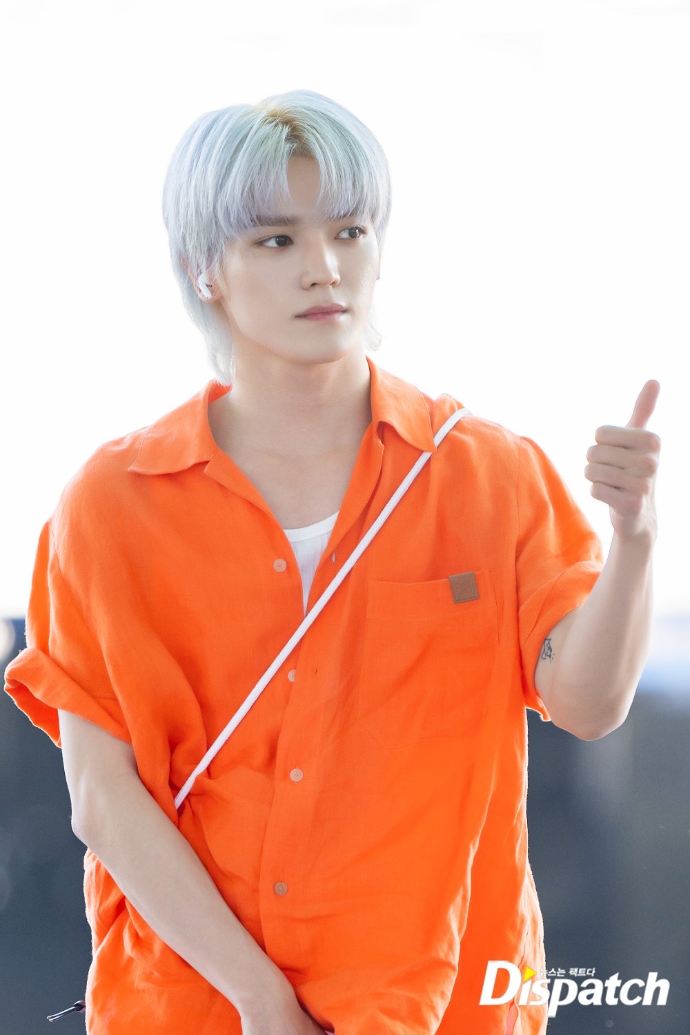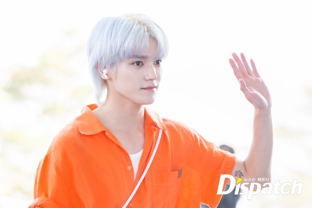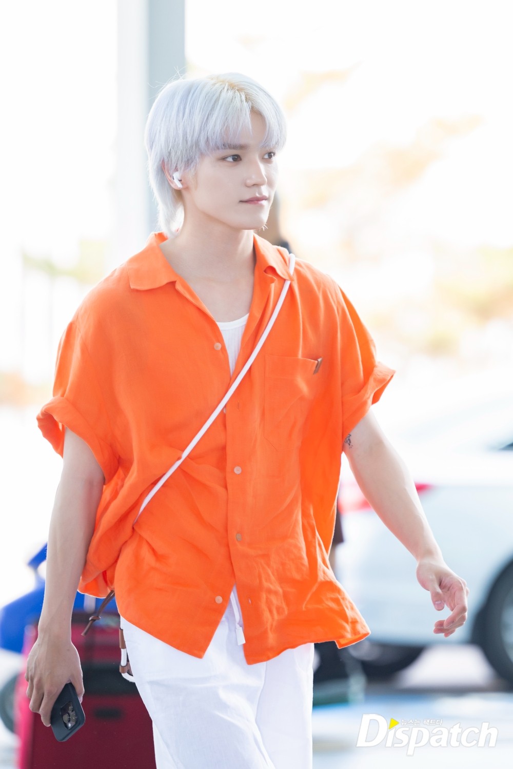 태용은 오렌지빛 셔츠와 화이트 팬츠로 멋을 냈다. 백금발 헤어스타일이 비주얼을 완성했다.