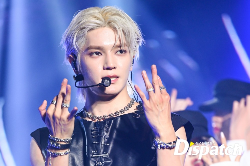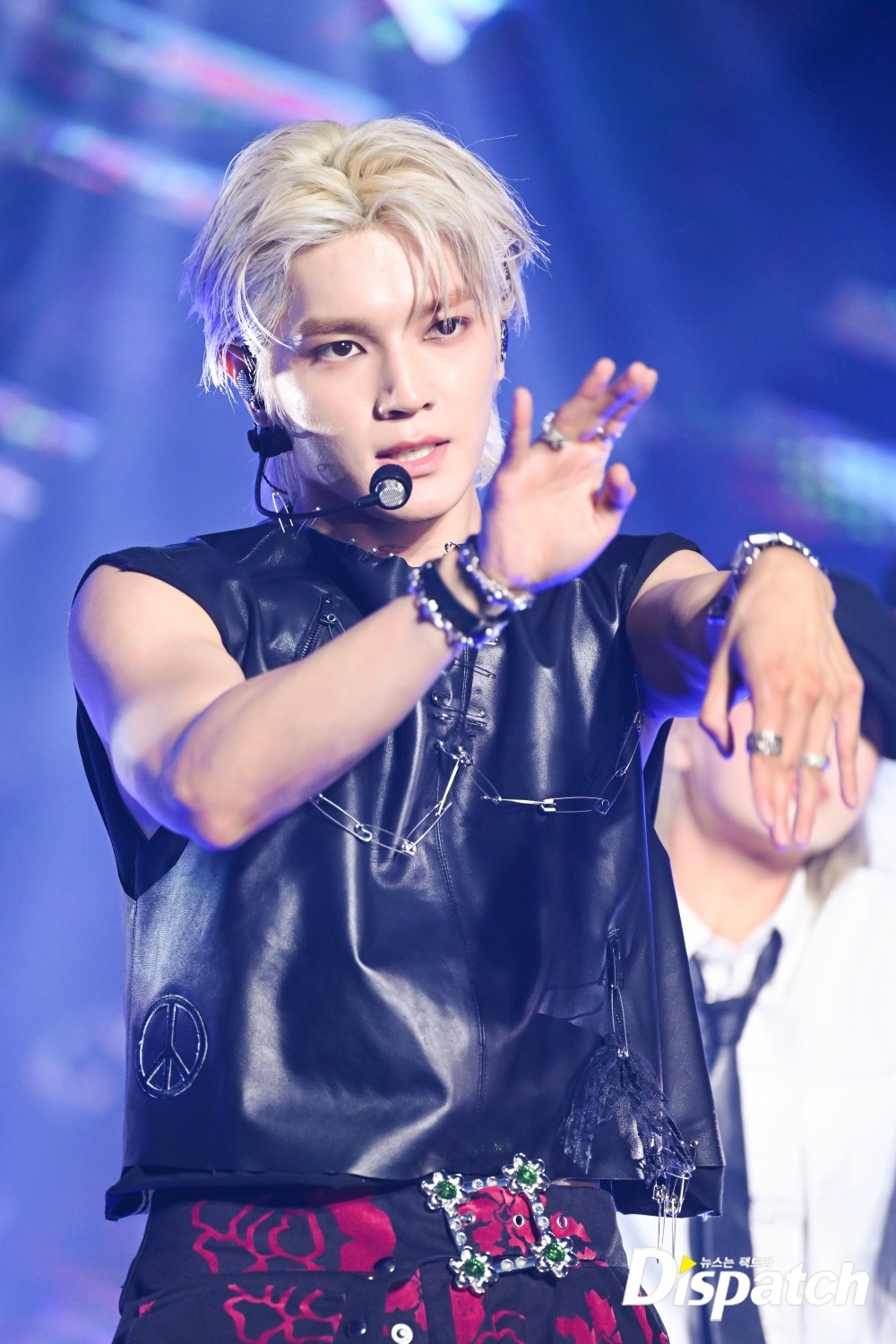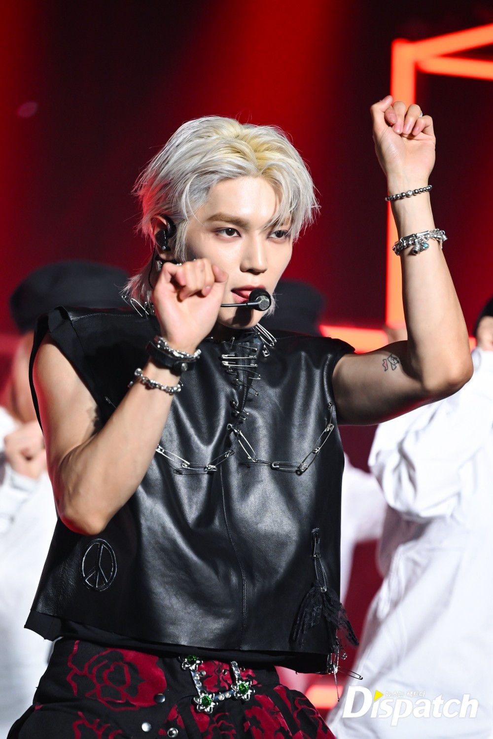 태용은 가죽 베스트와 찢어진 데님 팬츠로 멋을 냈다. 펑키한 분위기가 돋보였다.