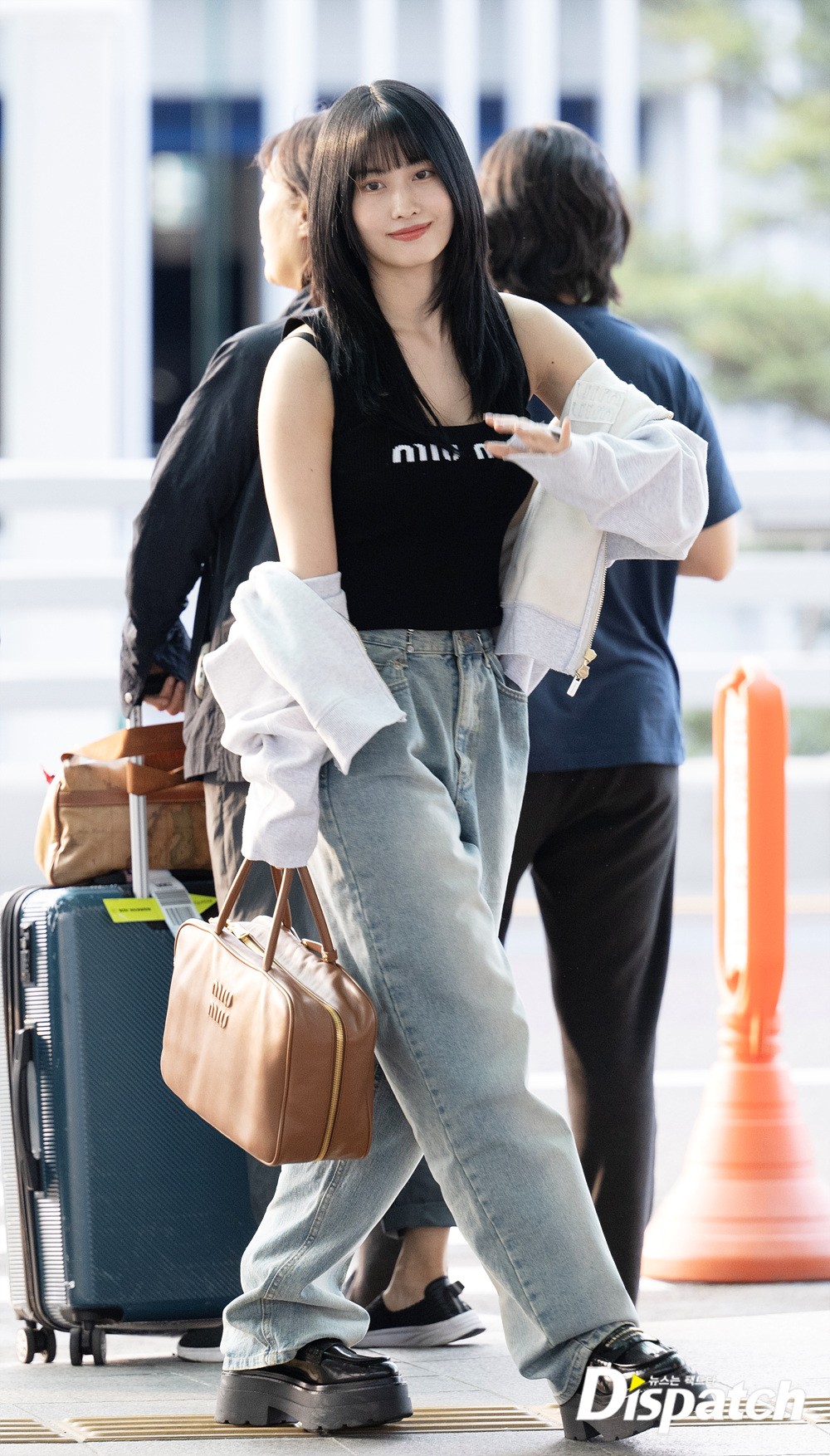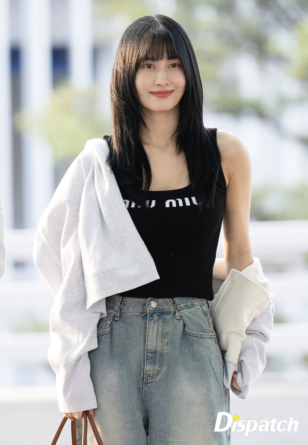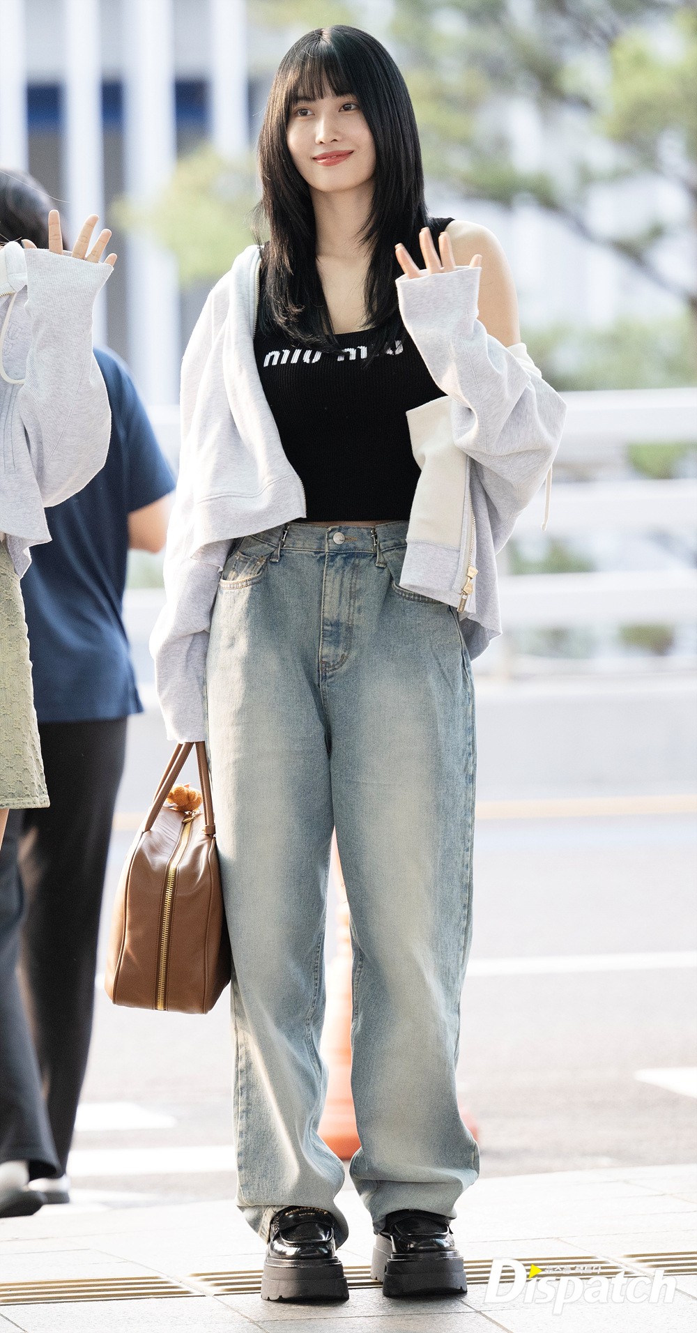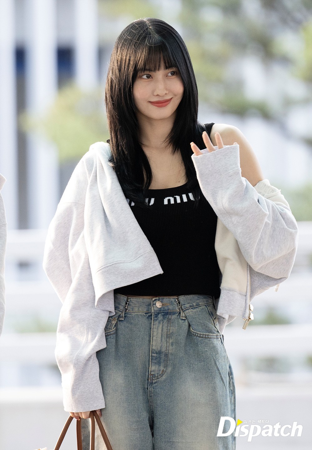 모모는 블랙 색상의 나시와 후드집업, 데님진으로 캐주얼한 공항패션을 완성했다. 공항에 모인 팬들에게 환한 미소로 화답했다.