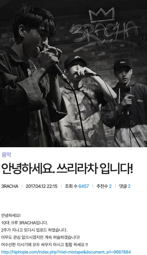 “10대 크루 쓰리라차입니다. 2주 후에 또다시 업로드했어요. 아무도 관심 없으시겠지만 계속 허슬하겠습니다!”