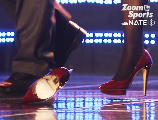 시상을 위해 걸어나오고 있는 중이었다. 순간, 그의 왼쪽 하이힐이 느닷없이 벗겨졌는데..
