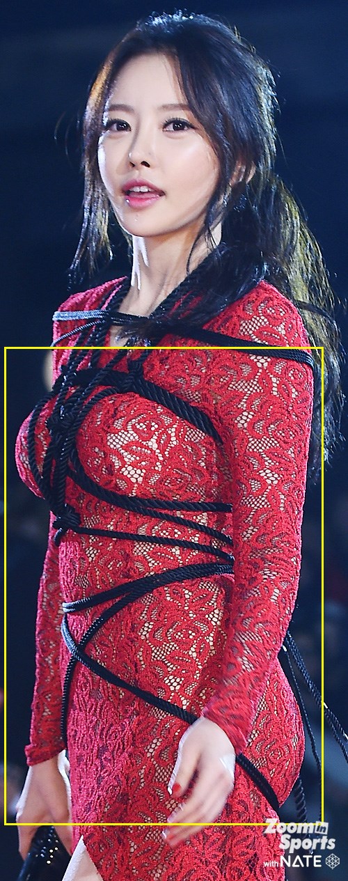 망사 계열의, 붉은색 시스루 드레스에 꽁꽁 동여맨 검정색 밧줄 패션. 일명 '밧줄 드레스'.