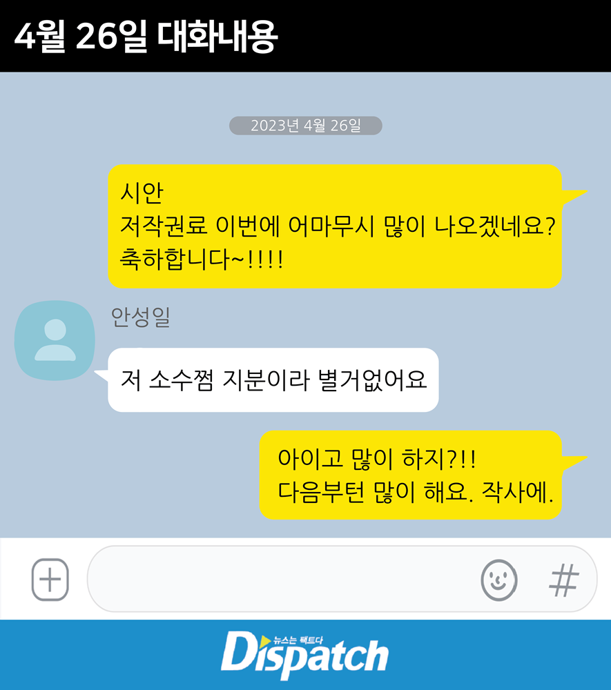 37. '디스패치'가 문제를 제기하자, 안성일이 (영어를 써가며) 급히 반박했습니다.