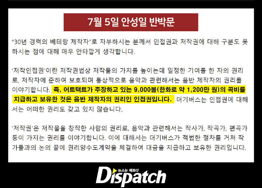 2. "어트랙트가 9,000달러(한화 1,200만 원)를 지급하고 보유한 것은 음반 제작자의 권리인 인접권입니다." (안성일)