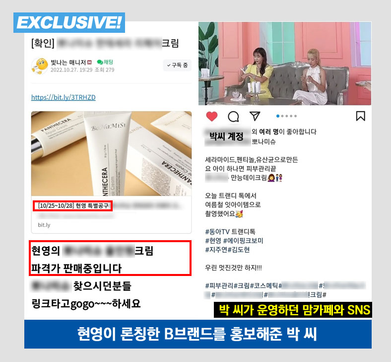 심지어 현영의 화장품을 맘카페에서 팔았다. '현영의 XX크림 파격가 판매'라는 게시글을 올렸다. 특별 공구 구매 좌표까지 찍었다. 개인 인스타그램에도 현영의 화장품 론칭을 적극 홍보했다.