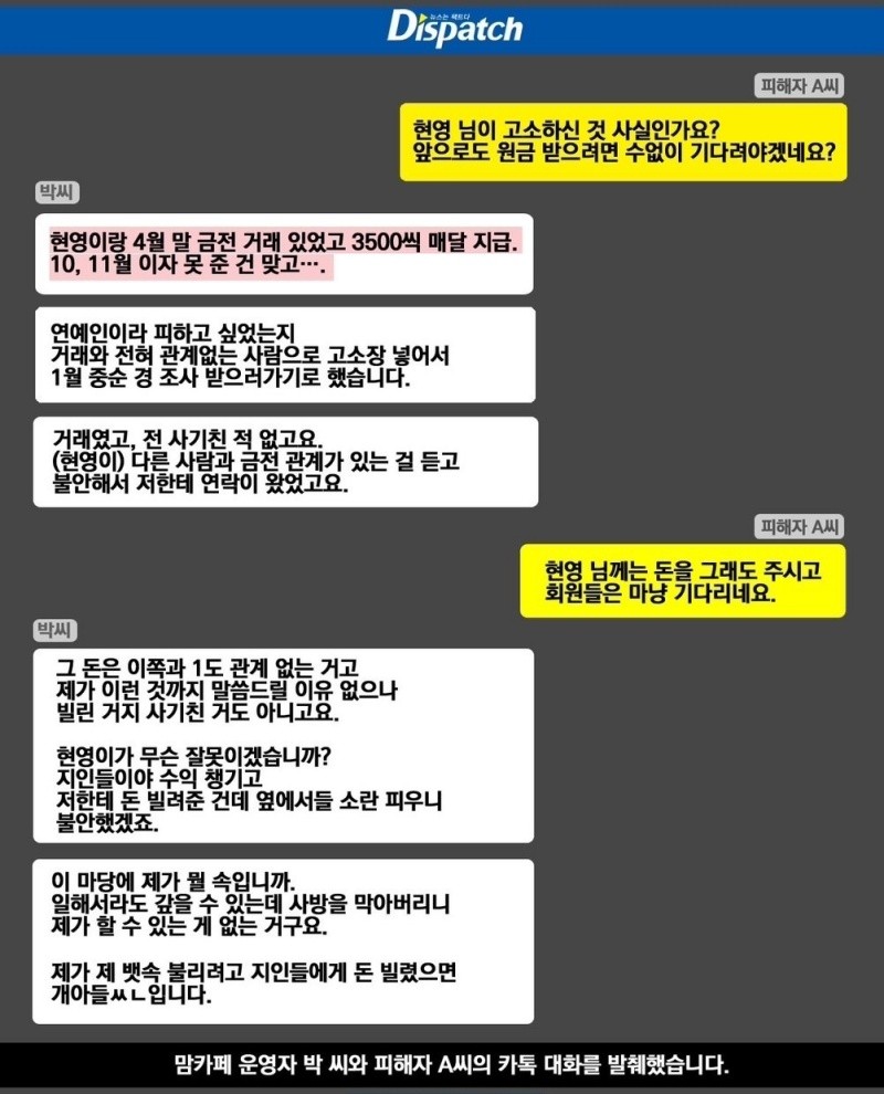 '디스패치'는 현영과 B씨의 카톡 대화를 입수했다. 현영은 지난해 4월 29일 오후 9시 54분, 1억 원씩 3차례를 송금했다. 또 같은 날 오후 10시 각각 1억 원씩 2억 원, 총 5억 원을 보냈다.