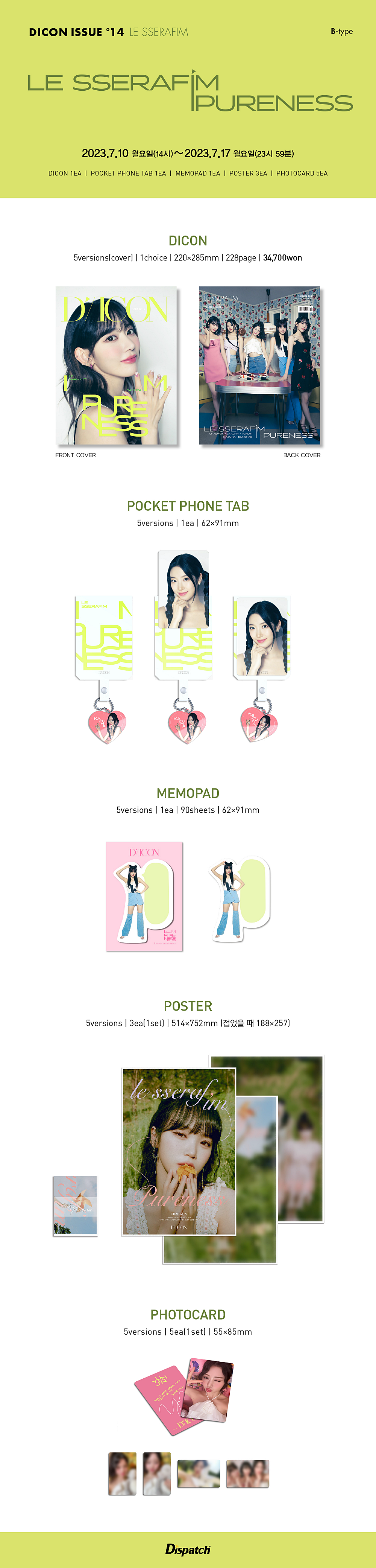 디아이콘 오는 10일 오후 2시 르세라핌 에디션 예약 판매를 시작한다. 예스24, 알라딘, 교보문고, G마켓, 다날엔터, 케이타운포유, 고분샤(일본) 등에서 예약할 수 있다. 마감일은 오는 17일 오후 11시 59분이다.