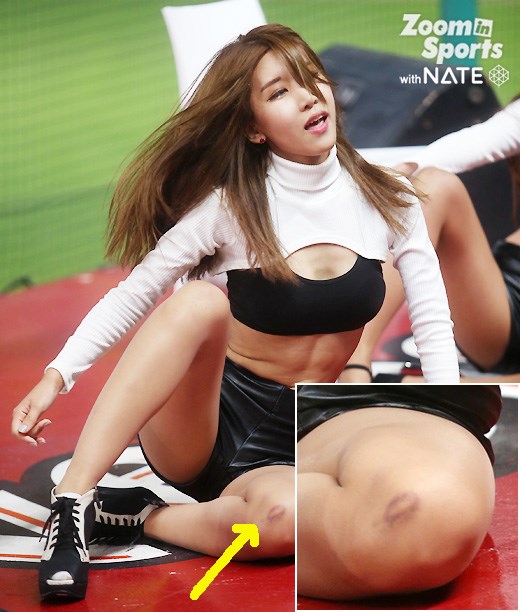 SK 김다희(왼쪽) 치어리더의 무릎에 그만..