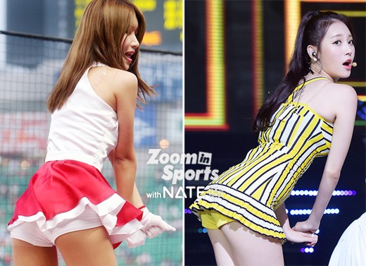SK 치어리더 김다희(왼쪽)는, 국내 최정상 인기 걸그룹 걸스데이의 '달링' 안무를 따라하고 있는 중이었다. 심지어 반바지 노출의 '정도'까지도 거의 흡사했을 뿐만 아니라, 안무소화력도 좋았다.