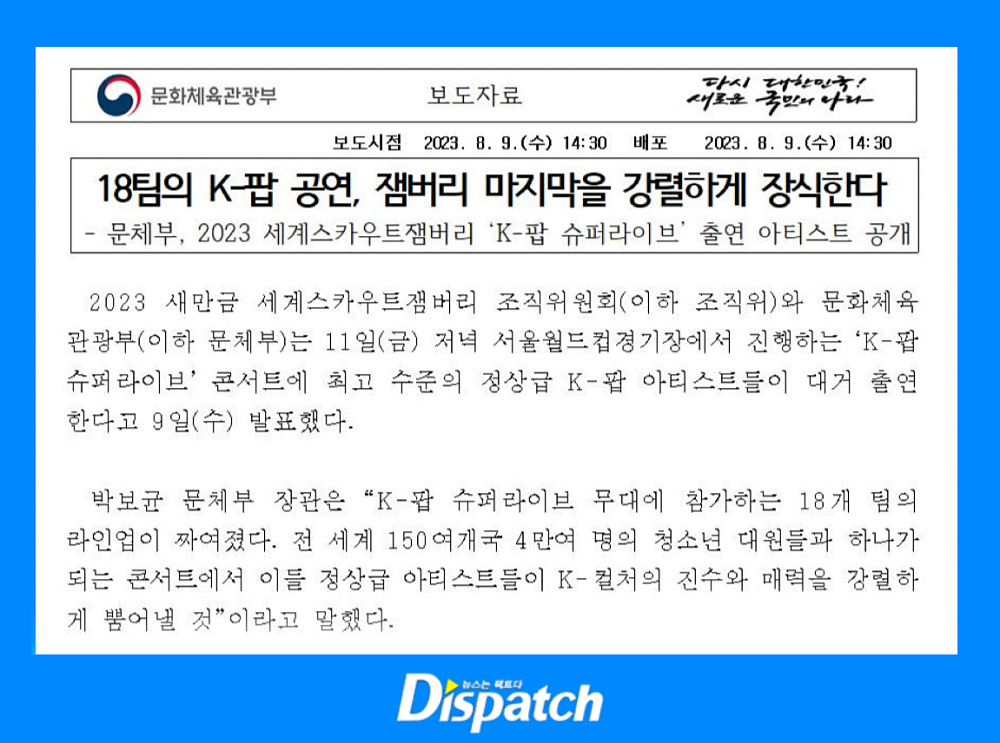'디스패치'는 지난 8~10일, 연예 기획사에 잼버리 참석 및 진행 상황을 물었다. 관계자들은 "국가 행사를 거절할 힘이 있나. 참석을 요청하면 맞출 수밖에 없다"고 답했다.