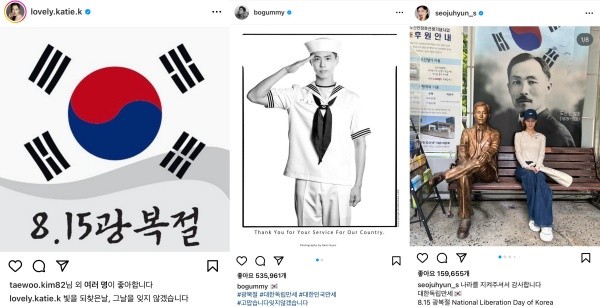 김희선은 SNS에 태극기를 올리며 광복절을 기렸다. "빛을 되찾은 날, 그날을 잊지 않겠다"고 적었다. 박보검은 자신의 제복 사진을 올리며 "잊지 않겠다"는 태그를 남겼다.