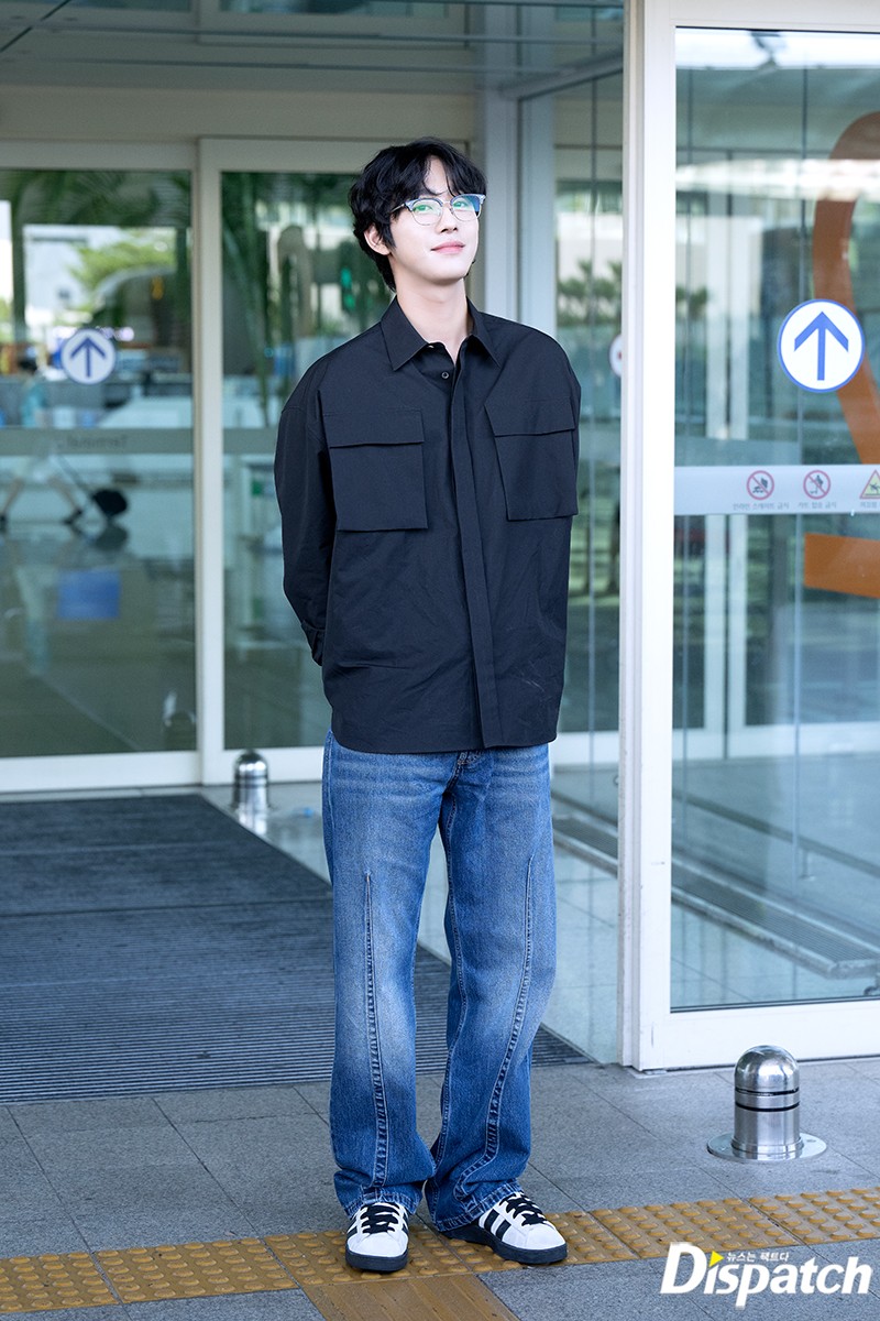 안효섭은 이날 청바지에 블랙 셔츠로 댄디한 공항패션을 연출했다. 우월한 기럭지와 비주얼이 돋보였다.