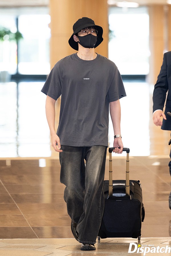 원우는 캐주얼한 반팔티와 청바지를 매치해 편안한 공항패션을 선보였다.