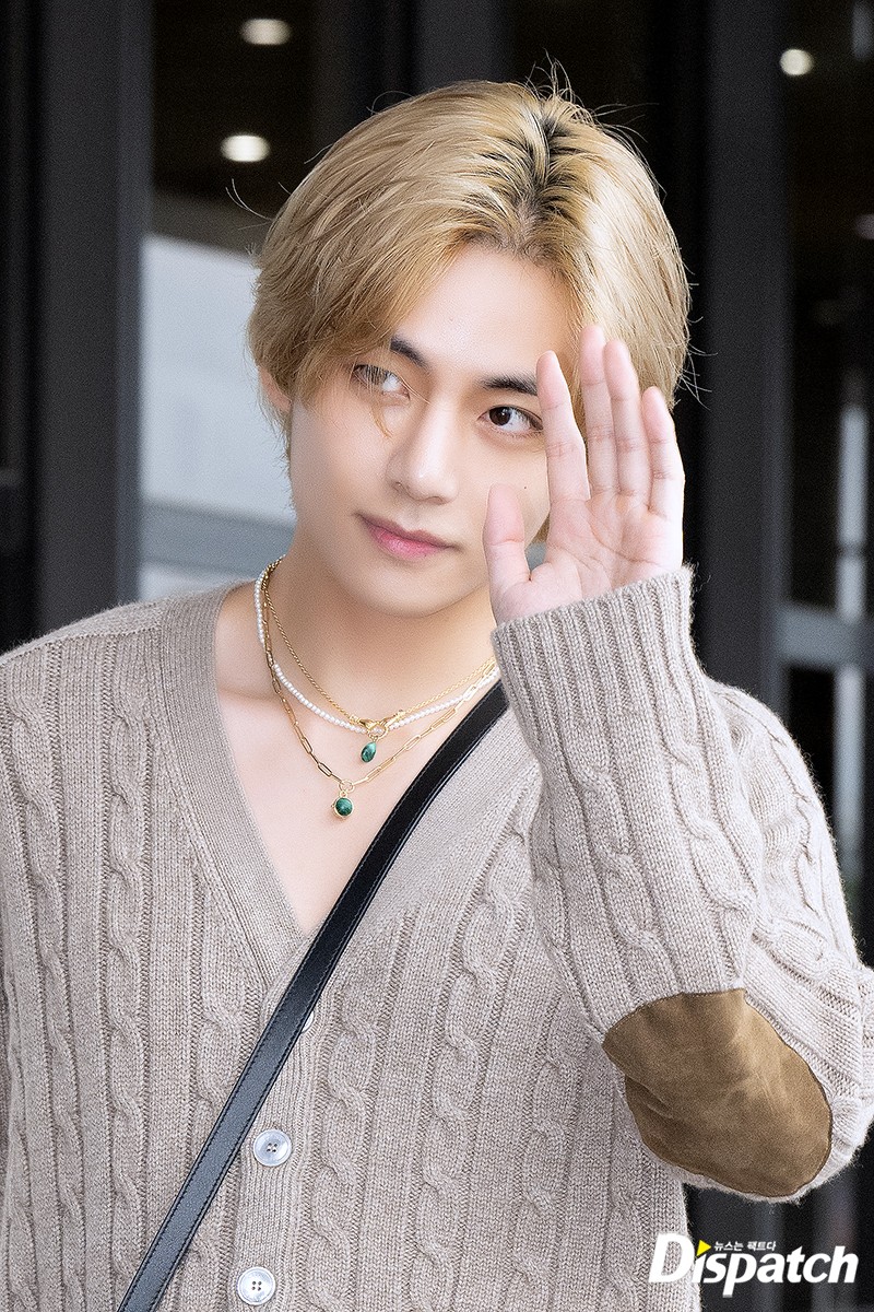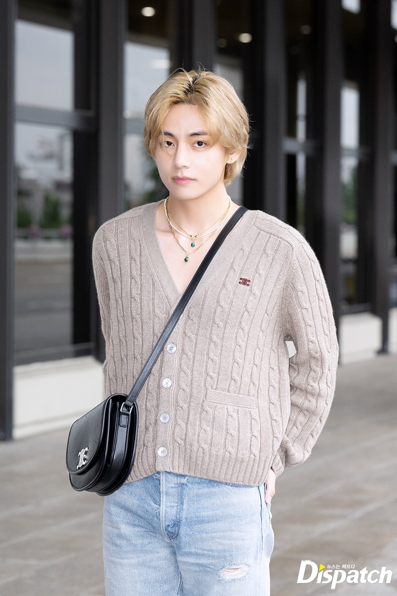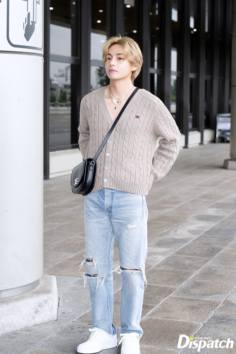 뷔는 이날 청바지에 니트로 댄디한 공항패션을 연출했다. 조각같은 비주얼이 돋보였다.