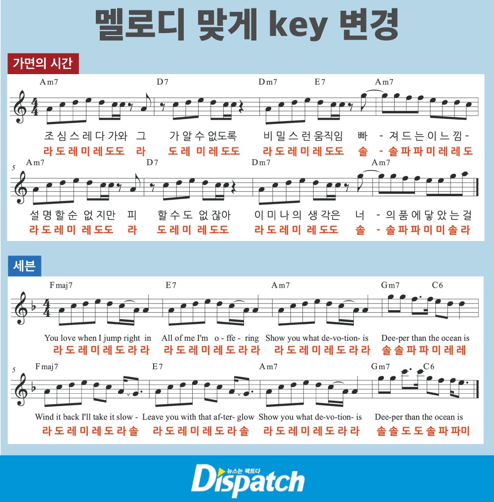 양준영의 주장에 따르면, 키를 조정하면 계이름이 일치한다는 것. '디스패치'는 멜로디 시작음을 동일선상으로 옮겼다. '가면의 시간'은 그대로(Am) 두고, '세븐'의 키를 F로 맞췄다.
