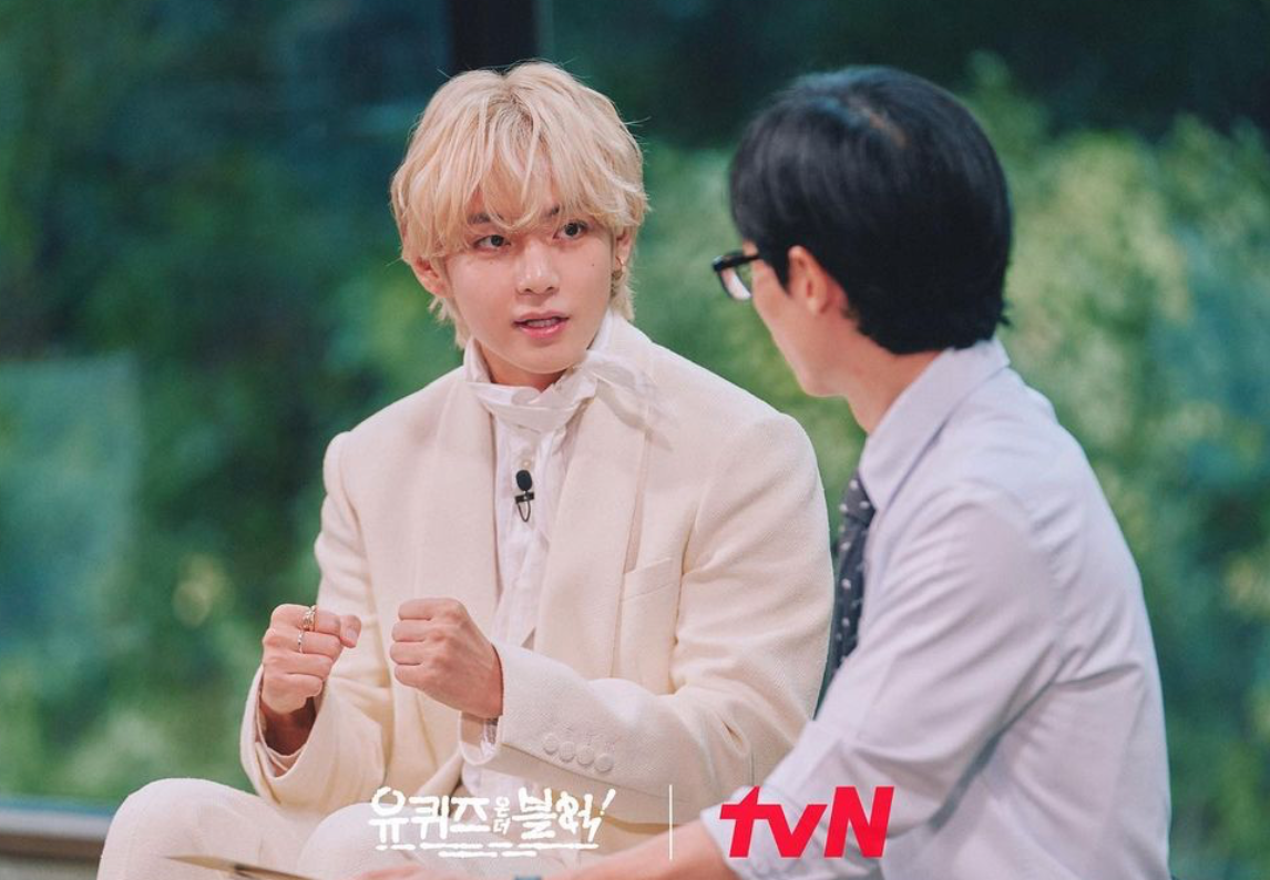 뷔는 금발의 왕자님으로 변신했다. 화이트 블라우스와 크림색 수트를 소화했다. 유재석, 조세호와 토크 케미도 돋보였다. 첫 솔로 앨범과 일상 속 진솔한 이야기를 전했다.