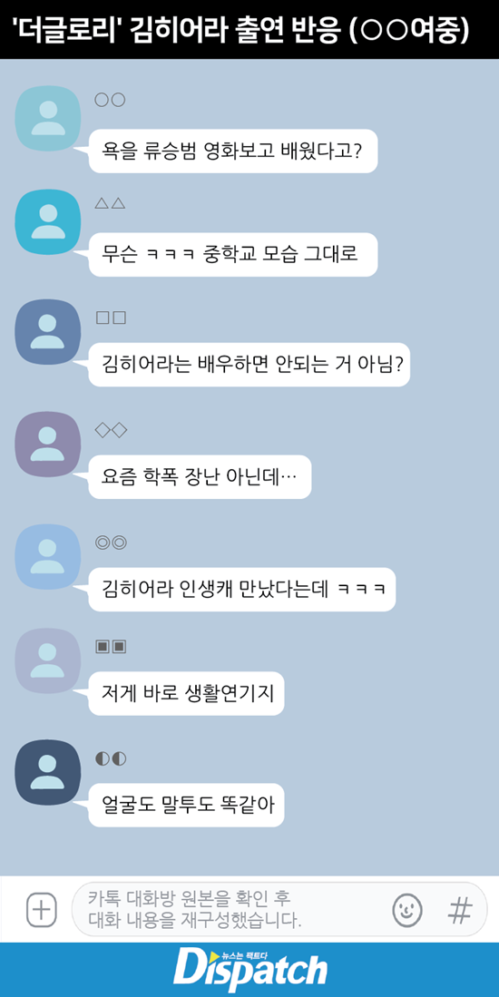 '디스패치'는 지난 5월, 김히어라 학폭 제보를 받았다. "○○여중 일진의 욕설을 드라마에서 다시 들을 줄 상상도 못했다"며 학폭 의혹을 제기했다.