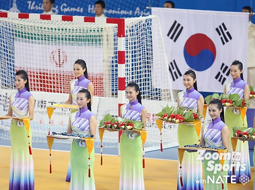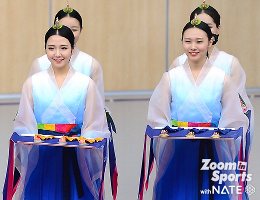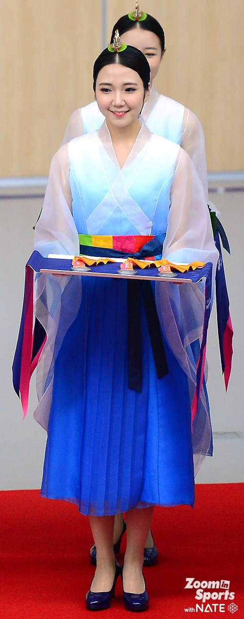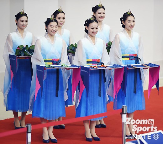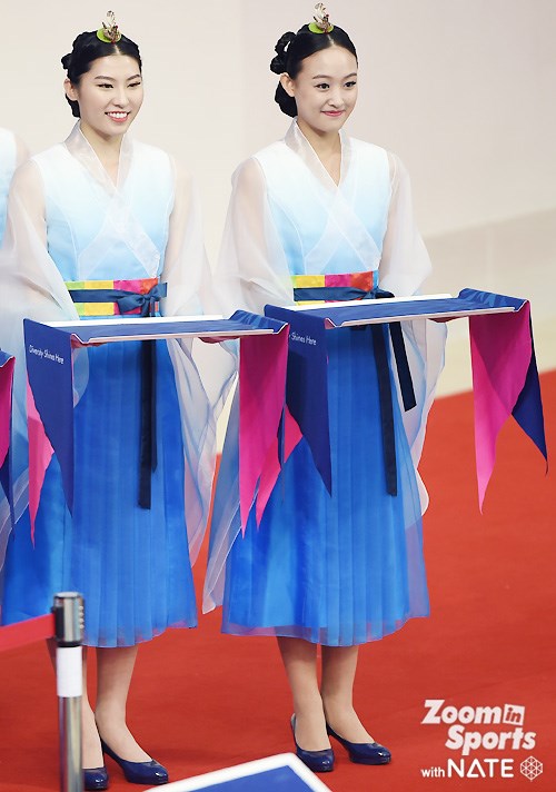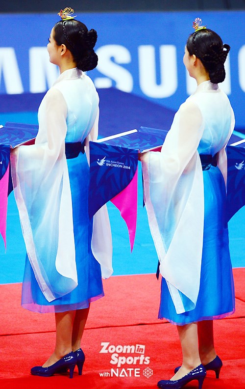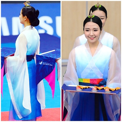 "누구가 더 예쁜가?". '한복vs치파오' 시상도우미 의상의 승자는 과연 누구, 광저우? 인천? 한편, 이번 인천 아시안게임 시상식 도우미는 224명으로, 모두 인하공업전문대학 항공운항과 학생들로 구성된 것으로 알려졌다. 아울러 그들이 입은 한복의 콘셉트는 선녀와 나무꾼의 바로 그 '선녀'였다.