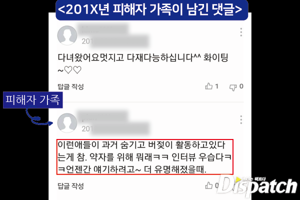 '디스패치'는 한 피해자 가족이 직접 올린 댓글을 찾았다. 201X년 올라온 김히어라 기사에 학폭 암시글을 썼다. (해당 가족에게 본인 확인을 마쳤다.)