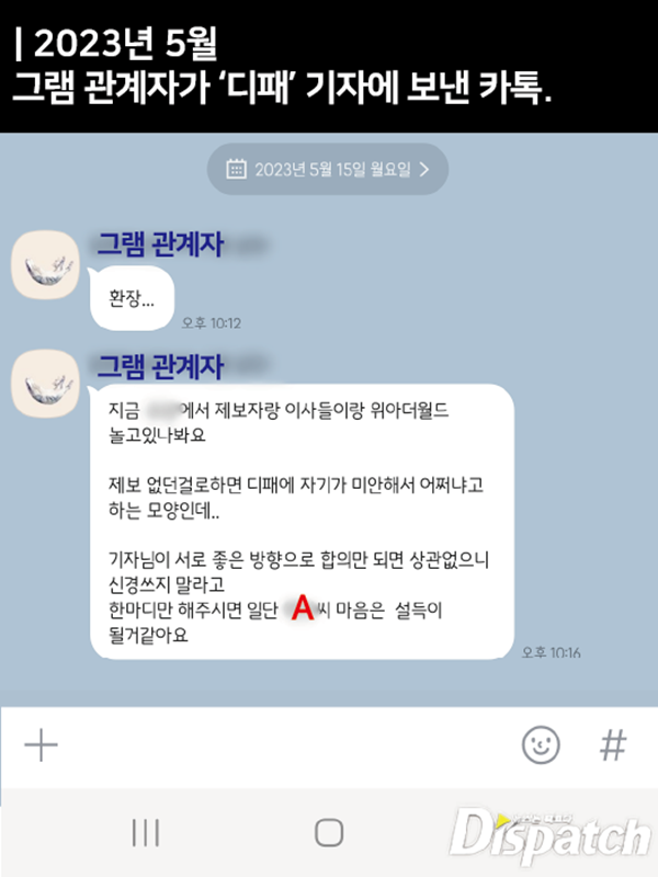 "제보자랑 이사들이 위아더월드 놀고 있나봐요. 제보 없던 걸로 하면 '디패'에 미안해서 어쩌냐는 모양인데. 기자님이 신경쓰지 말라고 한 마디만 해주시면 설득될 거 같아요." (관계자)