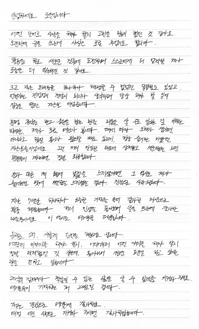 로운은 장문의 손편지로 심경을 전했다. "활동하고 새로운 것들에 도전하며, 스스로에게 더 엄격한 제가 익숙해진 것 같다"며 조심스럽게 그간의 고충을 언급했다.