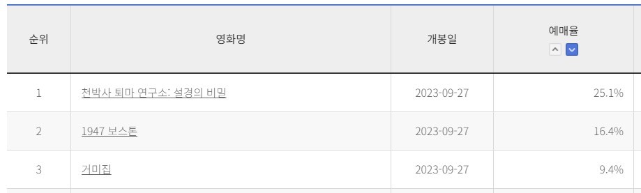 2위는 '1947 보스톤'(강제규 감독)이었다. 예매율 16.4%로 나타났다. '거미집'(김지운 감독)이 실시간 예매율 9.4%를 기록, 그 뒤를 이었다.