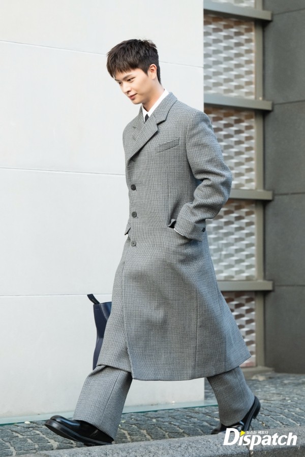 육성재는 체크 롱코트로 가을 분위기를 완성했다. 잘생긴 외모가 돋보였다.