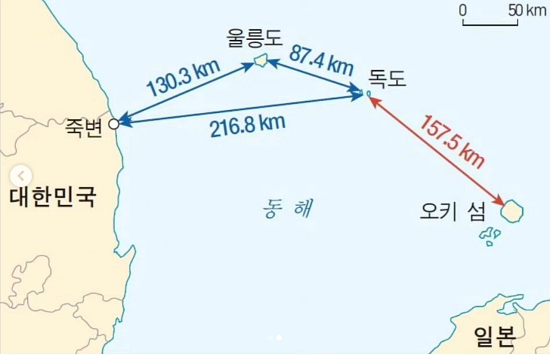 오키섬은 독도를 사이에 두고 울릉도와 대척점에 위치한다. 울릉도와 독도 간 거리는 87.4km, 독도와 오키섬은 157.5km다. 약 2배 가까이 차이 난다.