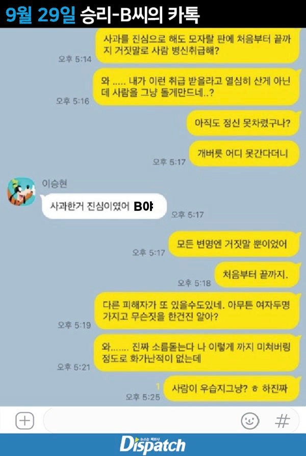 B씨는 '디스패치'에 "A언니의 스토리를 보고 내 눈을 의심했다. 승리와 갔던 식당, 카페 사진이 (언니) 인스타에 있었다"며 그날의 악몽을 전했다.