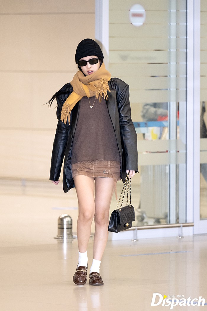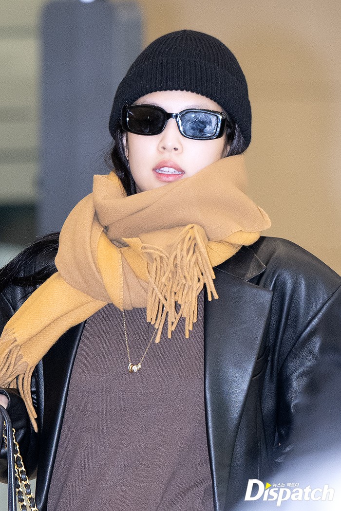 제니는 이날 레더 재킷으로 시크한 공항패션을 선보였다. 우아한 미모와 남다른 분위기도 돋보였다.