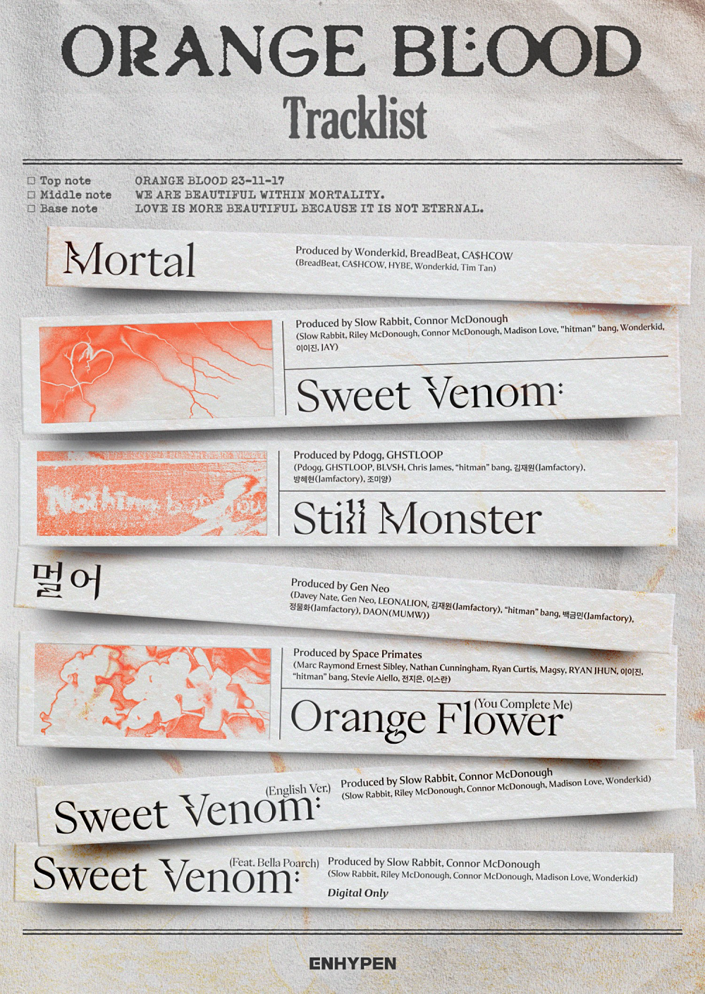 '빌리프랩'은 6일 공식 SNS에 엔하이픈의 미니 5집 '오렌지 블러드'(ORANGE BLOOD) 트랙리스트 포스터를 공개했다. 신보에는 다양한 장르의 7곡을 담았다.