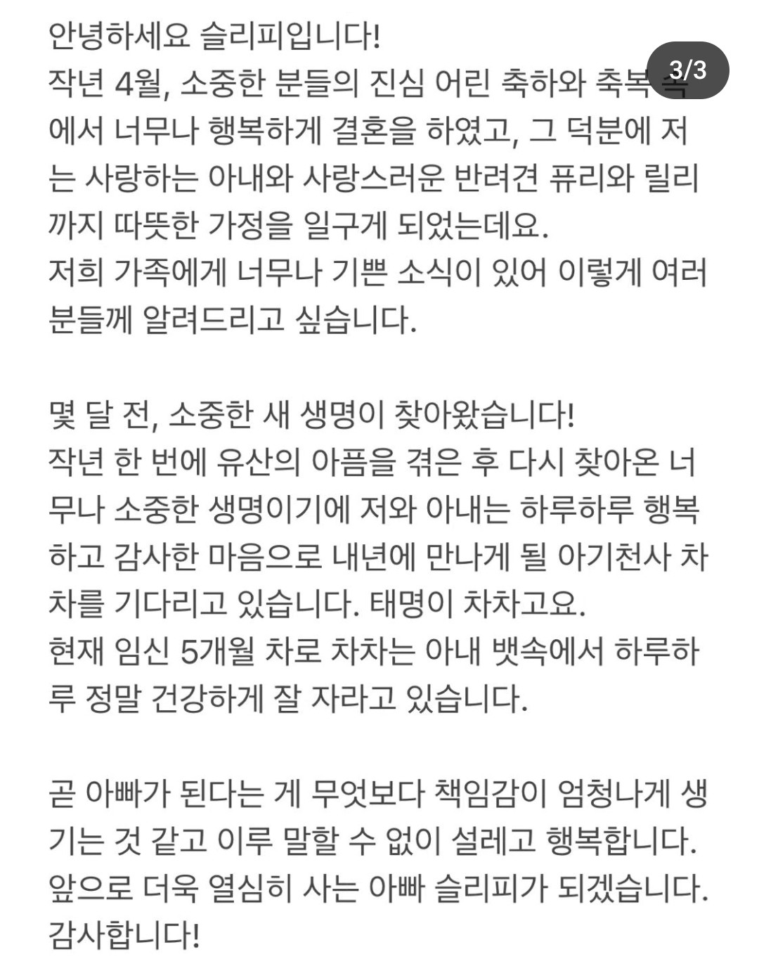 마지막으로 "곧 아빠가 된다는 게 무엇보다 책임감이 엄청나게 생기는 것 같다"며 "이루 말할 수 없이 설레고 행복하다. 앞으로도 열심히 사는 아빠 슬리피가 되겠다"고 덧붙였다.